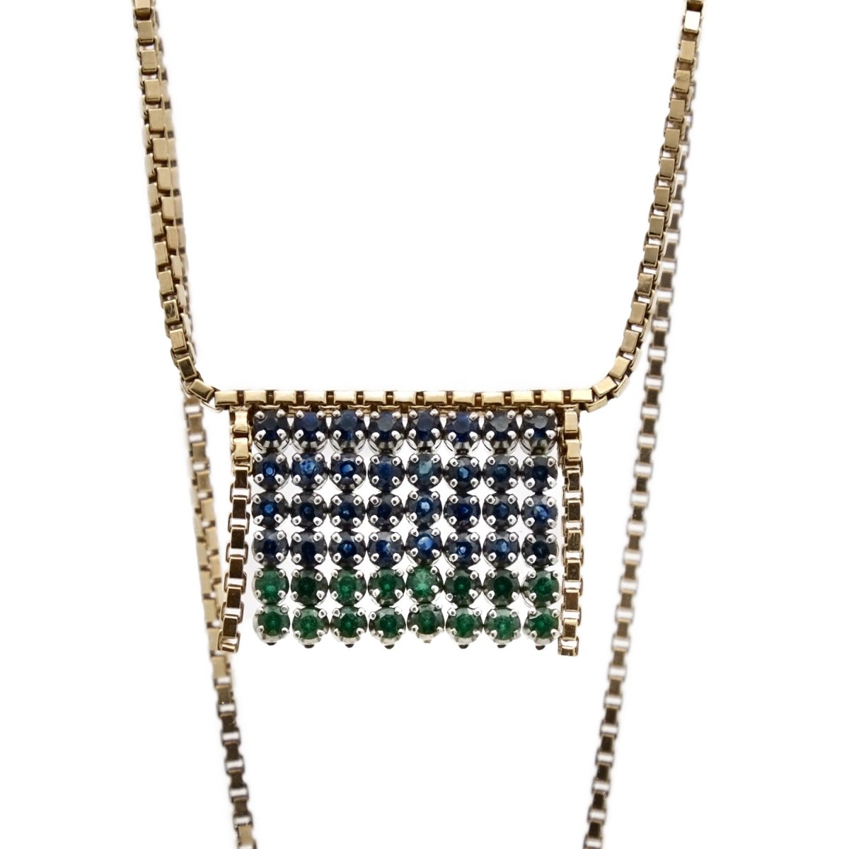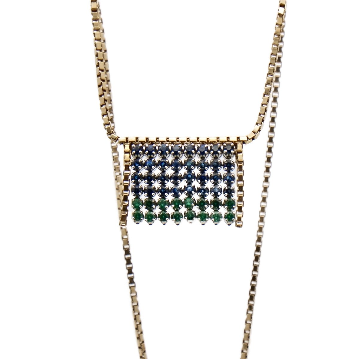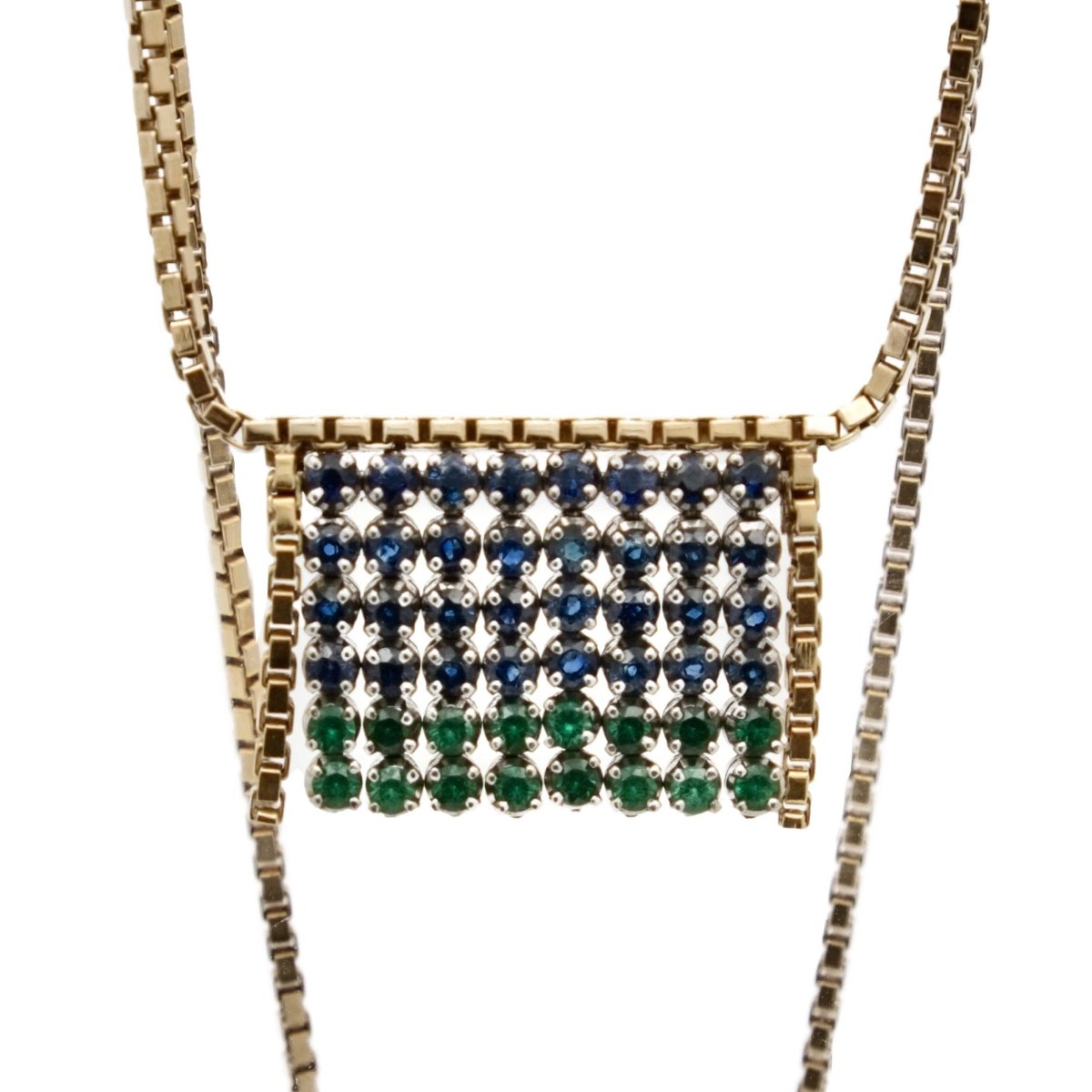 Certaines pièces mêlent émeraudes et saphirs, plus rarement rubis, parfois perles de culture en ponctuation régulière. Chaque produit de la collection mentionne la longueur, la maille, l'origine déclarée de la pierre, le nombre de carats et la présence éventuelle d'oxydes de zirconium en pavage quand ils sont utilisés en alternative aux diamants.