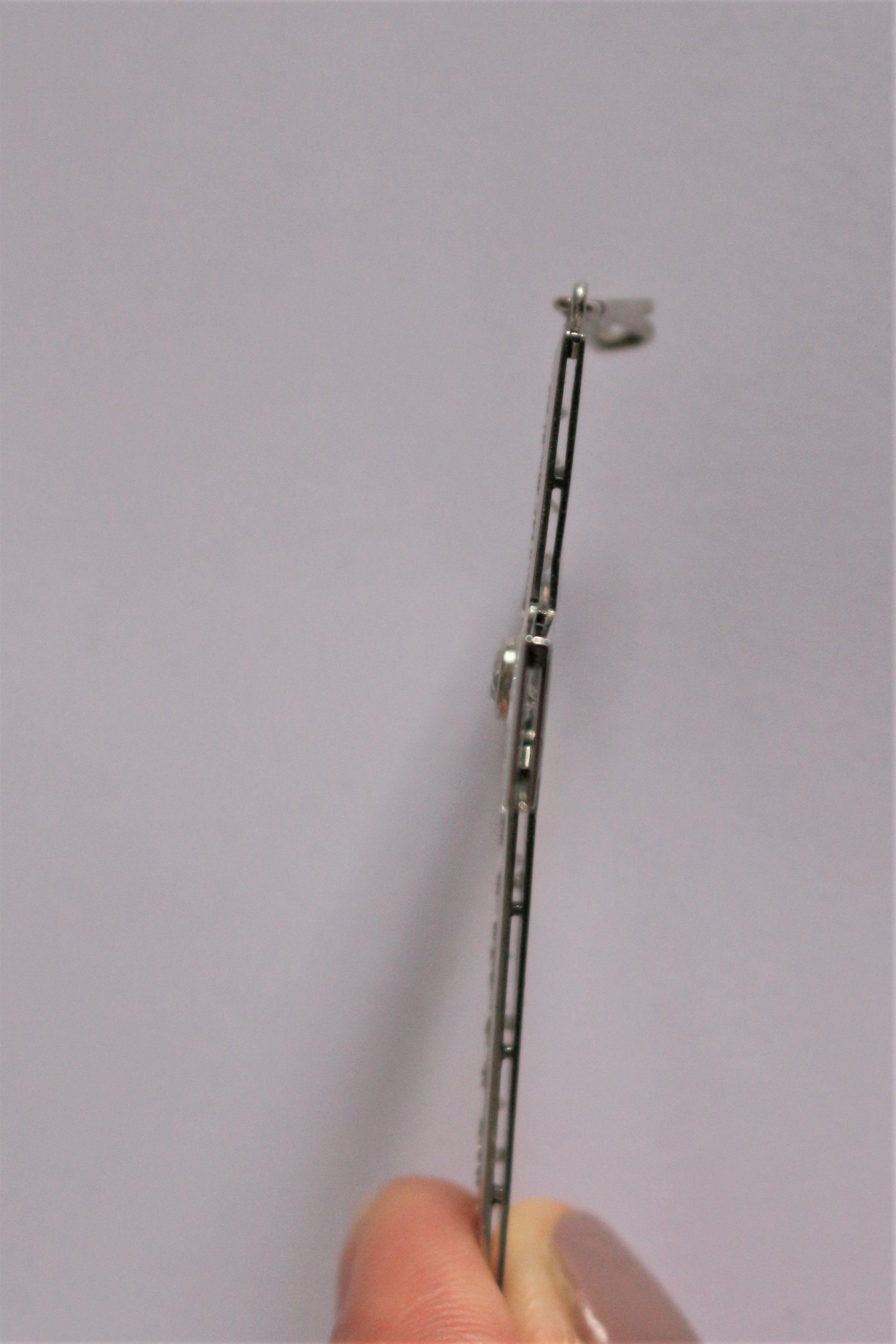Cross pendant in platinum (850/1000th) openwork, with scroll motifs, set with an alignment of 8/8 and old cut diamonds, Art Deco. Diamond bail. Diamonds: 27 diamonds of 2 mm + 1 diamond of 4 mm + 1 diamond of 1 mm for a total of 1.04 ct. Gross weight: 9.6 gr Condition: good general condition, micro scratches from use on platinum.Dimensions: 5.5 cm long and 6.7 cm with the bail, 3.9 cm wide Hallmarks: bearded man's head mask for platinum second-hand object 850/1000th and illegible French goldsmith's mark at the level of the ring of the crossref. 529