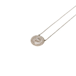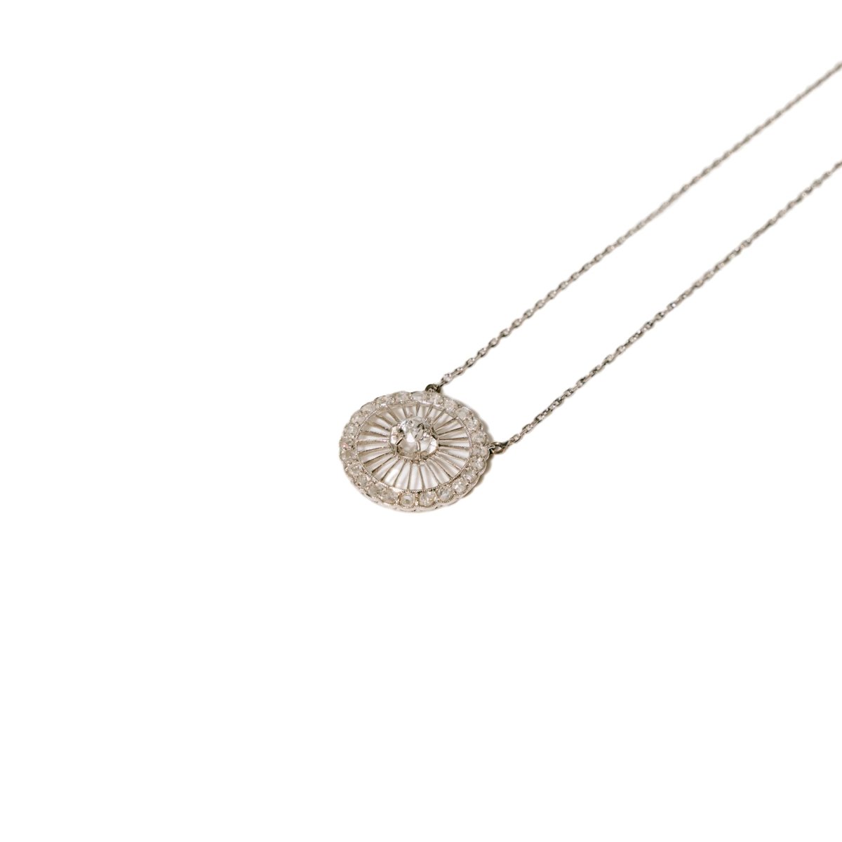 Necklace composed of a round pendant and its platinum chain, set with diamond roses and centered with an old-cut round diamond. Weight: 4.8g