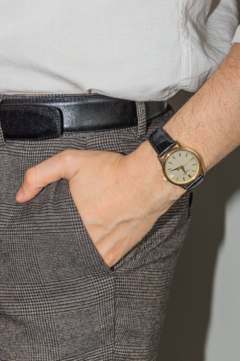 Patek Philippe Calatrava model yellow gold watch. caliber 3001989 315/190. white dial with stick indexes. mechanical movement with automatic winding. 34mm case. sapphire crystal. leather strap with pin buckle (Wrist size 21cm adjustable. Bracelet width 1.6cm) revision 05/2024. year 70/80. Saint Bernard hallmark.