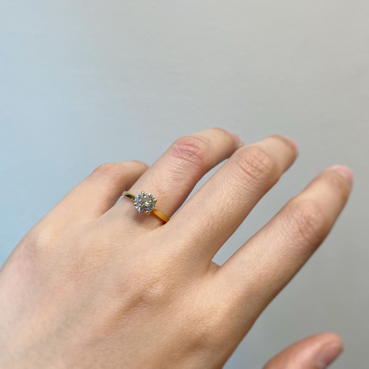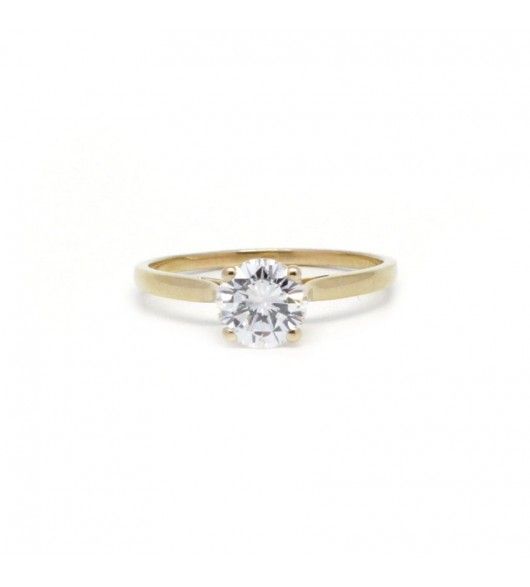 Solitaire in 750 yellow gold. set with a 0.92 carat diamond (D/VS2) HRD certified. Finger size: 53 Resizing possible.
