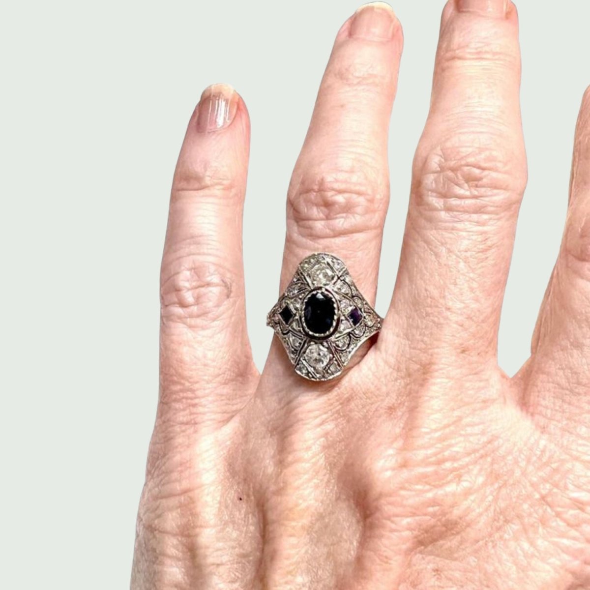 Ref. Q894A Brilliant talla diamonds 0.65 cts Zafiros corte oval and corte square SI color H Platinum 950 kts Size 11 Weight 3.84 grs Bite in kitten and grains