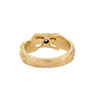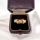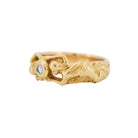 Ring in yellow gold 18-carat. It is adorned with a diamond 0.10-carat brilliant-cut central gemstone. The ring is beautifully hand-worked, depicting two women draped and entwined around the diamond.