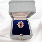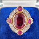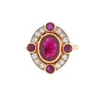 Ring halo in yellow gold 18 carats. It is set in its center with a natural Burmese ruby weighing approximately 2.14 carats, surrounded by 12 diamonds rounds totaling approx. 0.5 carat, and 4 natural Burmese rubies totaling approx. 0.80 carat. NB: A gemology report from the Bellerophon Institute has been carried out, indicating heated ruby with minor residue.