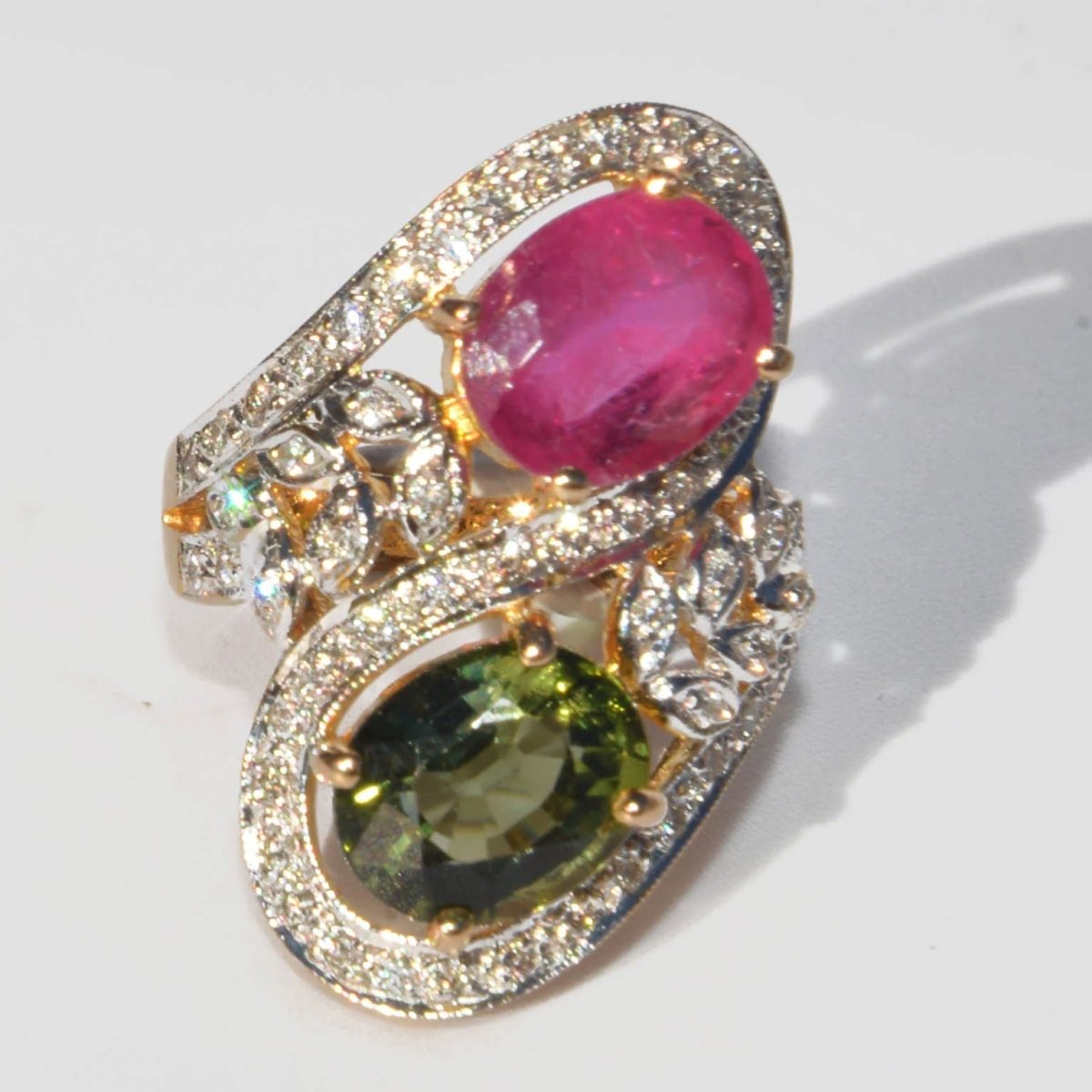 You and me cocktail ring, in yellow and white gold set with tourmalines