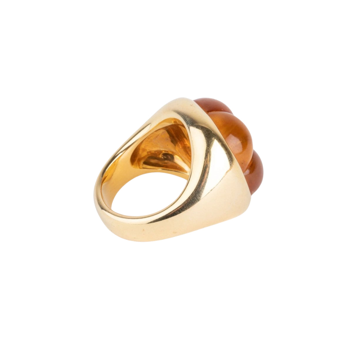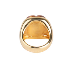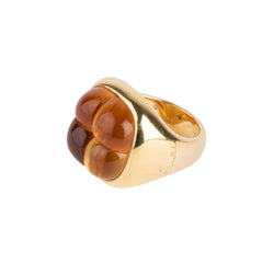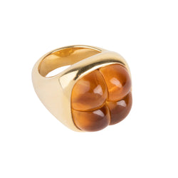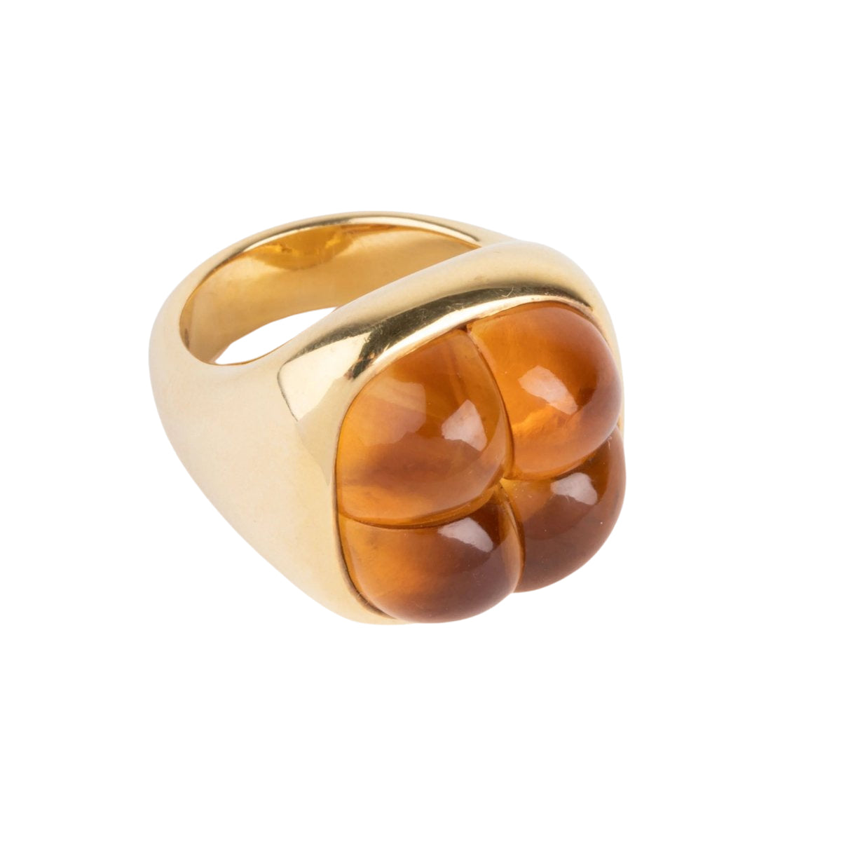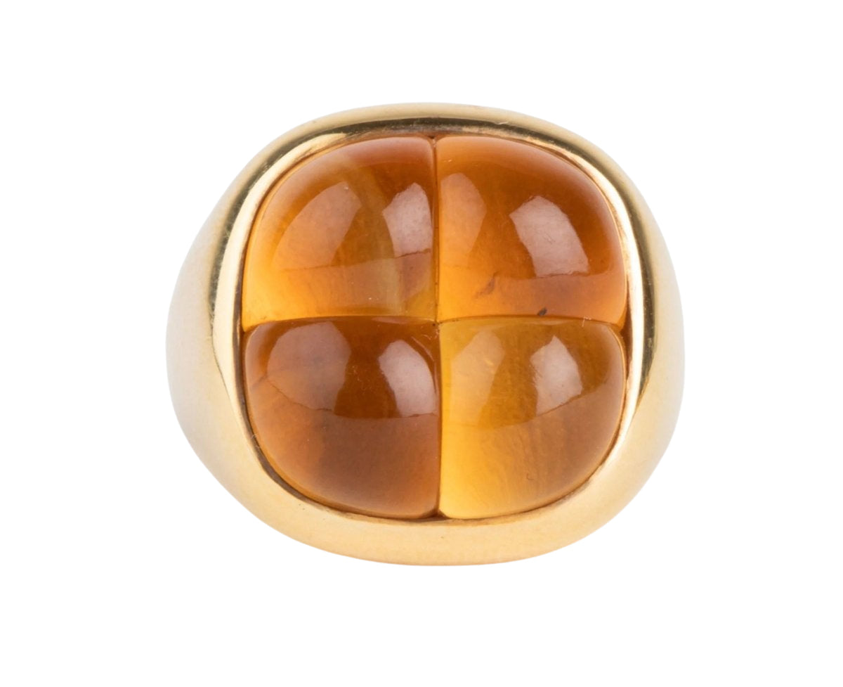 Ring from the Pomellato Mosaïque collection in yellow gold and citrine, decorated in its center with 4 beautiful geometric cabochons in citrine. Material: 18k yellow gold Hallmark: Signature Weight: 25.5 grams Length: 2cm Width: 2cm Adjustable finger size: 55 Stone: Citrine Period: 2000