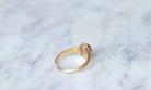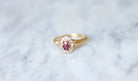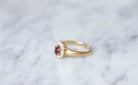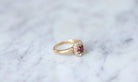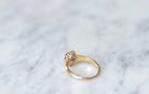 Daisy engagement ring in 18Kt rose gold (hallmark: owl), the center of which is adorned with a ruby weighing approximately 0.30 Ct in a setting of rose-cut diamonds. Total weight of diamonds estimated at approximately 0.10 Ct. French work from the 19th Century. Gross weight: 2.34g Pattern height: 1.00 cm Finger size: 54 (diameter 16.75 / US 6.25). Condition: very light micro scratches and oxidation on the gold parts, slight wear of the setting, and natural inclusions in the stones, some shocks and losses on the diamonds, see photos.