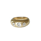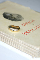 Domed bangle ring in 18kt yellow gold, adorned with three old-fashioned cut diamonds, the central one weighing approximately 0.55 Ct (Estimated clarity SI, estimated color J), and the two smaller ones approximately 0.60 Ct in total (estimated clarity VS and the color is estimated I/J). Vintage work, French. Gross weight: 10.63g Ring size: 54 (diameter 17.00/ US 6.75). Height: 0.80 cm. Condition: micro scratches on the gold parts, slight shock on a diamond on the side, wear of the setting, see photos. Diamonds , like gold, can withstand high temperatures. To clean your ring, it is therefore recommended to immerse it in hot water with a little dishwashing liquid, then rub it gently with a toothbrush. Find other tips for caring for your jewelry in our journal! All our antique rings.