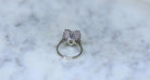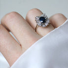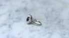 Ring "skirt" in white gold 18 carats, set with a central oval sapphire (probable origin: Siam or Australia), surrounded by diamonds trapeze cut. Circa 1960