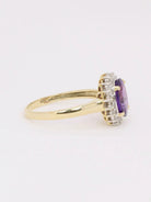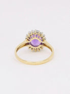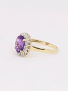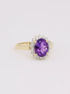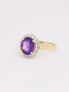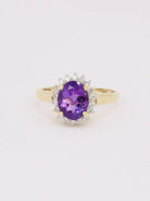 Vintage daisy ring yellow gold oval amethyst diamonds 14k (585°/°°) gold daisy ring set in its center with an oval-cut amethyst weighing 2.1 carats and surrounded by 18 diamonds weighing approximately 0.5 carats. Finger size 60, resizing possible. Gross weight: 3.75 grams