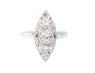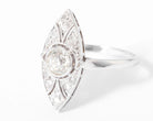 Marquise ring from the 1930s decorated in its center with a larger old cut diamond of approximately 0.80 ct and roses. Material: White gold and platinum Hallmark: Owl Weight: 4.5 grams Length: 2cm Width: 1 cm Adjustable finger size: 53 Carat number: 0.80 ct Number of stones: 12 stones Period: 1930