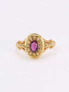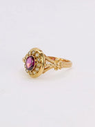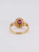 Victorian ring in yellow gold, garnet and fine pearls 18k gold ring (750°/°°) set in its center with an oval garnet in closed setting weighing approximately 0.8 carats (7.17x 5.26x2.8mm) in a surround of 12 fine pearls. Beautiful gold work on the ring. French work from the end of the 19th century. Presence of the eagle's head hallmark for 18 carat gold and trace of manufacturer's hallmark. Finger size 61, resizing possible Tray dimensions: 1.34 x 0.96 cm Gross weight: 3.69 grams