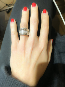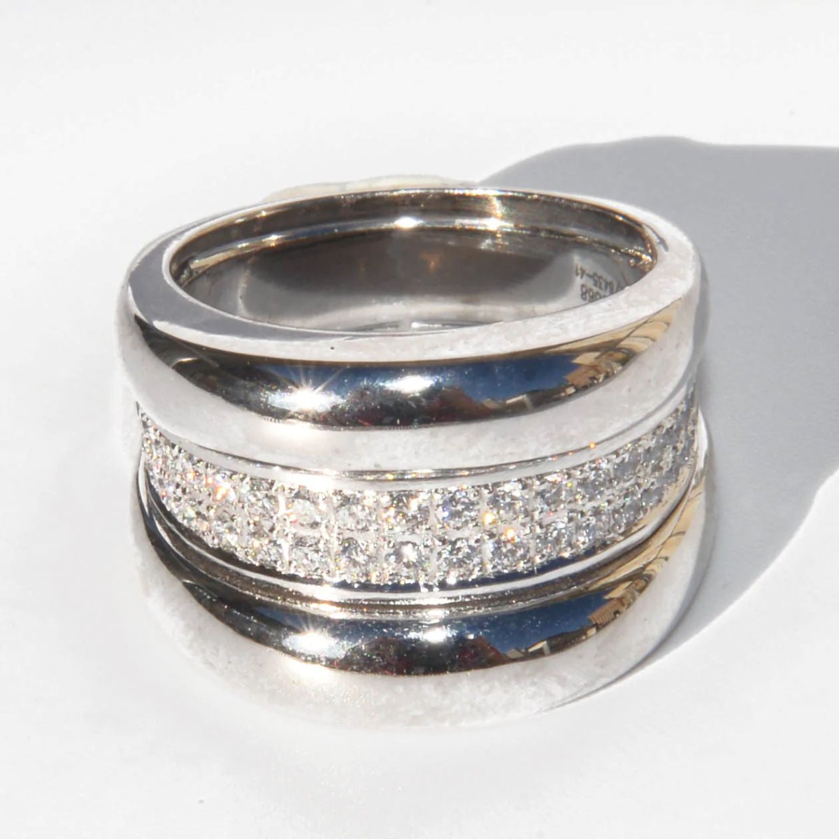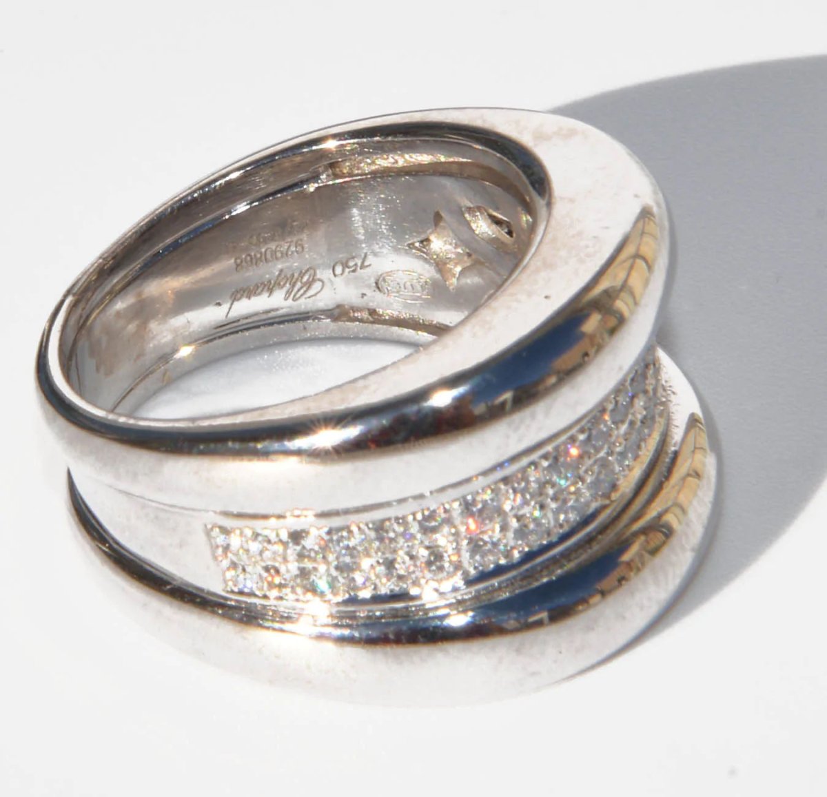 A band ring signed Chopard, Strada model, in white gold set with a double line of 42 brilliant-cut diamonds between 2 gadroons. Material: 18k white gold Hallmark: Eagle's head Weight: 15.5 grams Width: 1.5 cm Adjustable finger size: 57 Carat number: 0.60 ct Number of stones: 44 Period: 2010