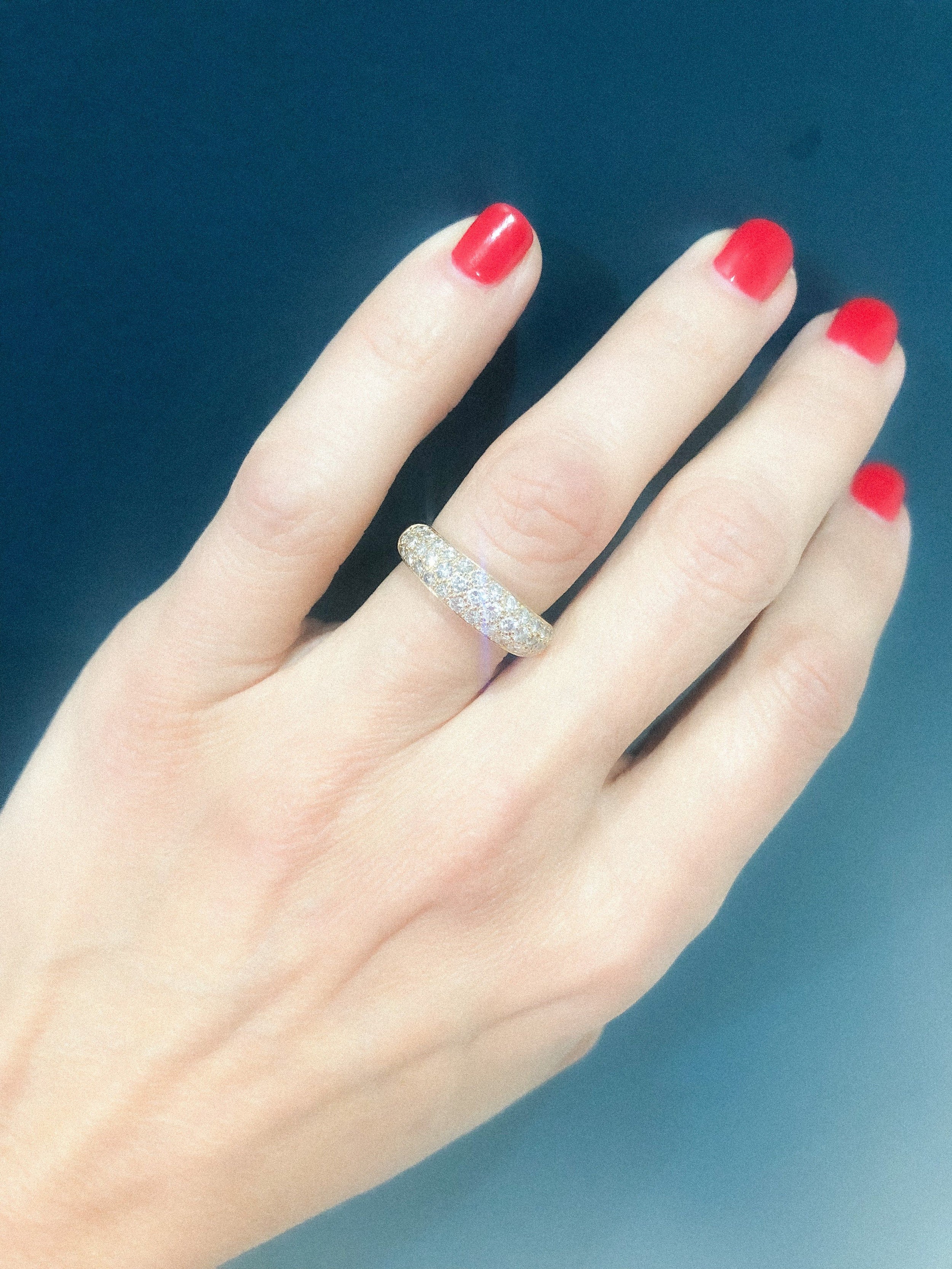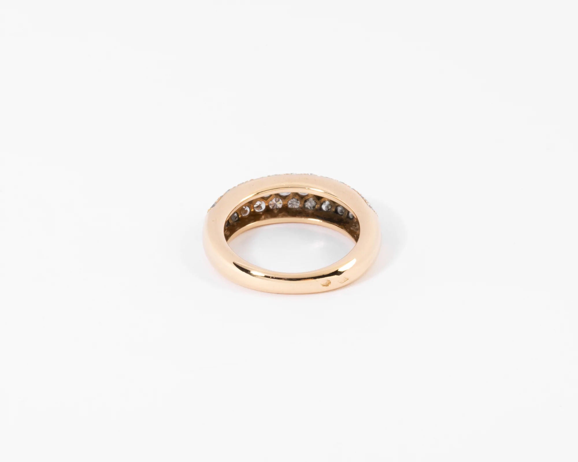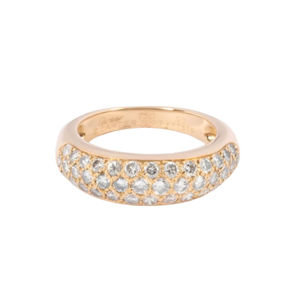 Yellow gold ring from Cartier forming a bangle paved with diamonds Material: 18k yellow gold Hallmark: Signature and numbered Weight: 5.9 grams Width: 0.6cm Adjustable finger size: 53 Carat number: 1.3 cts Number of stones: 40 diamonds Period: 2000