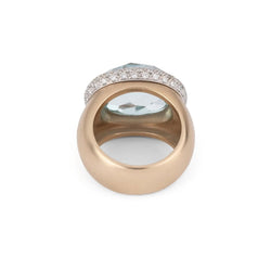 Sandblasted pink gold ring signed by the Italian house Pomellato, iceberg model adorned with a faceted oval aquamarine cabochon enhanced with a beautiful domed white gold border entirely paved with 2 rows of brilliant-cut diamonds. Material: 18k sandblasted rose gold Weight: 22.1 grams Width: 1.7cm Adjustable finger size: 59 Diamond: 1.70 cts Stone: Faceted aquamarine Period: Year 2010