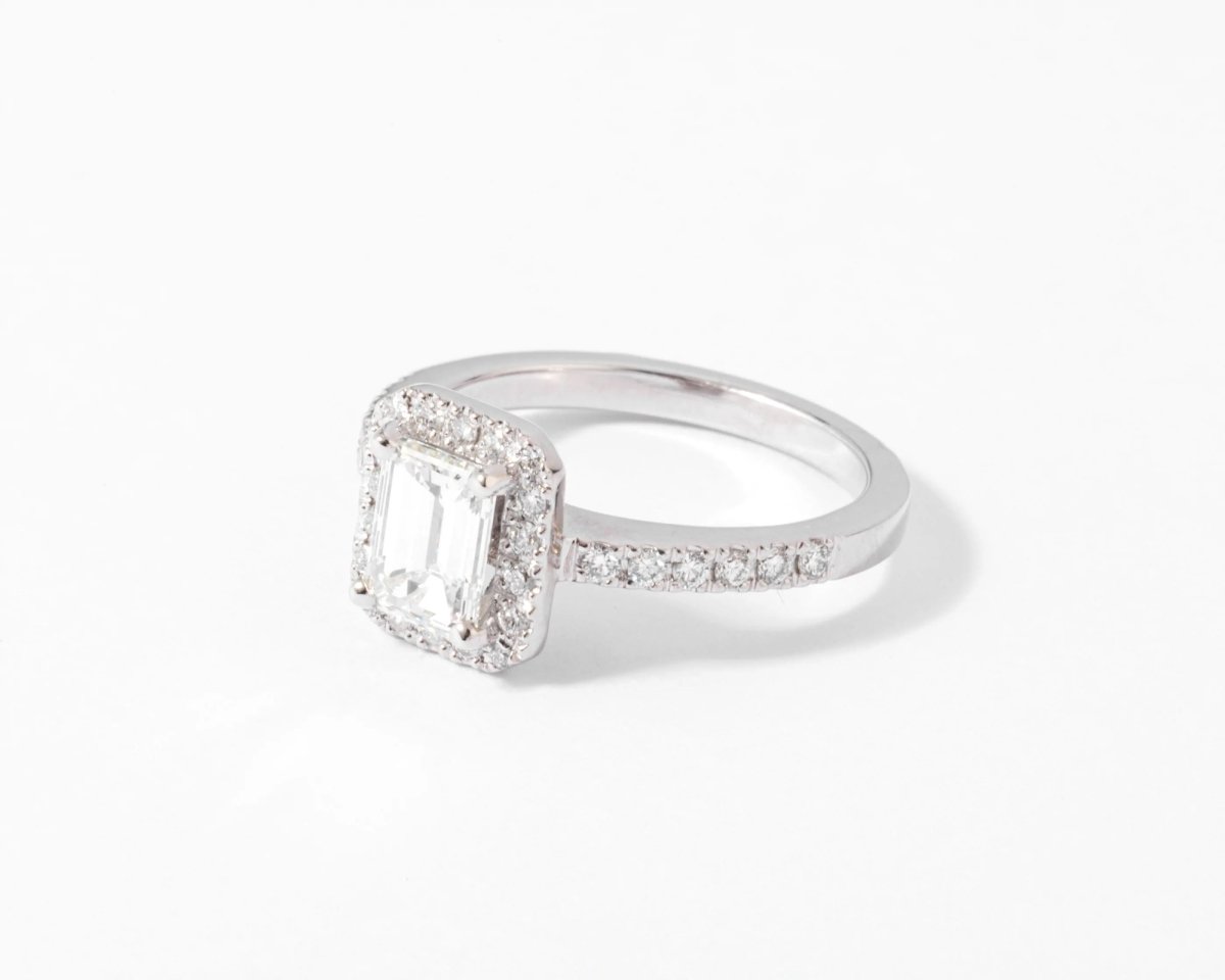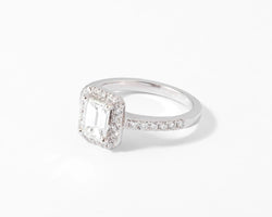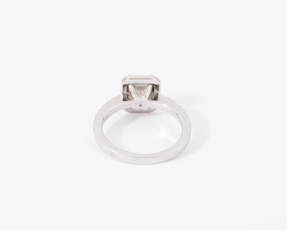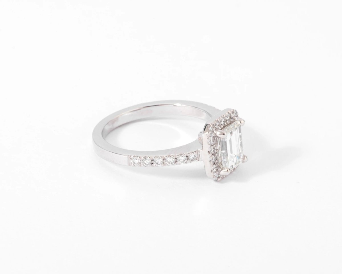 Solitaire ring in white gold decorated with an emerald-cut diamond of approximately 1.17cts with certificate from the Paris laboratory stipulating its color G Purity: VS2 nicely surrounded by diamonds around and on the sides. Material: Grey gold Hallmark: Eagle's head Weight: 4.6 grs Length: 0.7cm Width: 1cm Changeable finger size: 52 Carat number: 1.17 central and 0.30 ct Number of stones: 31 stones Period: 2010