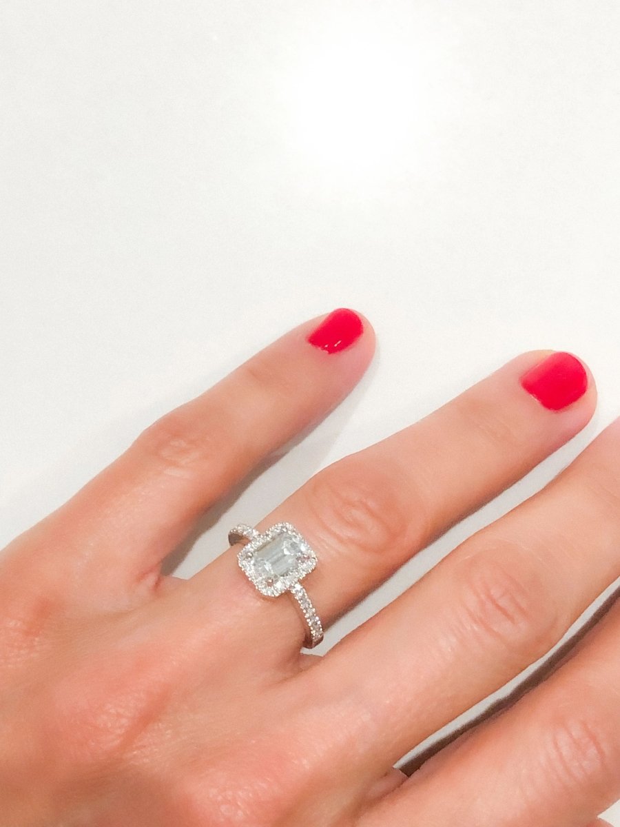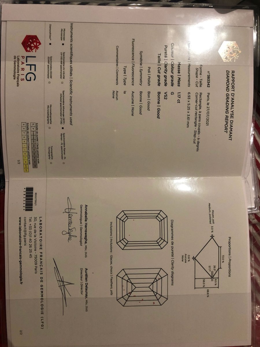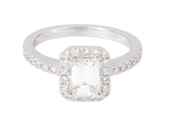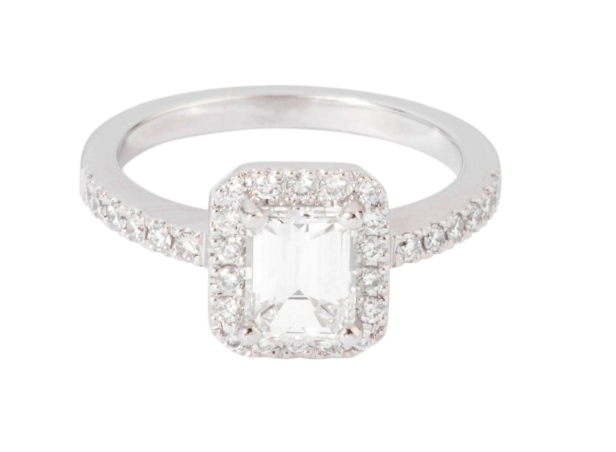 Solitaire ring in white gold decorated with an emerald-cut diamond of approximately 1.17cts with certificate from the Paris laboratory stipulating its color G Purity: VS2 nicely surrounded by diamonds around and on the sides. Material: Grey gold Hallmark: Eagle's head Weight: 4.6 grs Length: 0.7cm Width: 1cm Changeable finger size: 52 Carat number: 1.17 central and 0.30 ct Number of stones: 31 stones Period: 2010
