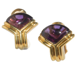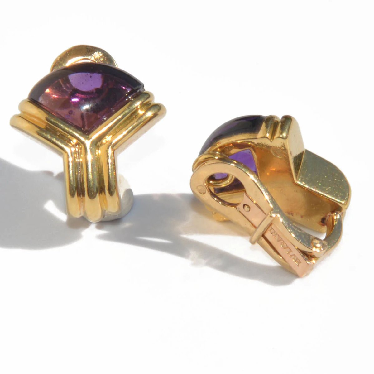 Yellow gold earrings from Bvlgari, decorated with 2 cabochon amethysts forming a triangle on a gadrooned gold motif. Material: 18k yellow gold Hallmark: Signature Weight: 18 grams Length: 1.5cm Width: 1.5cm For non-pierced ears modifiable: Stone: Amethyst Period: 1990