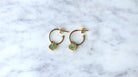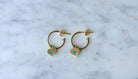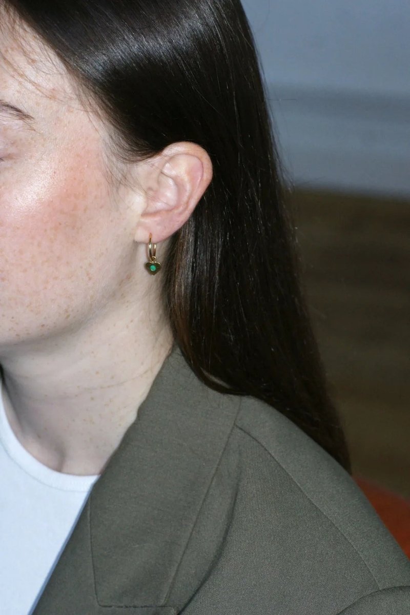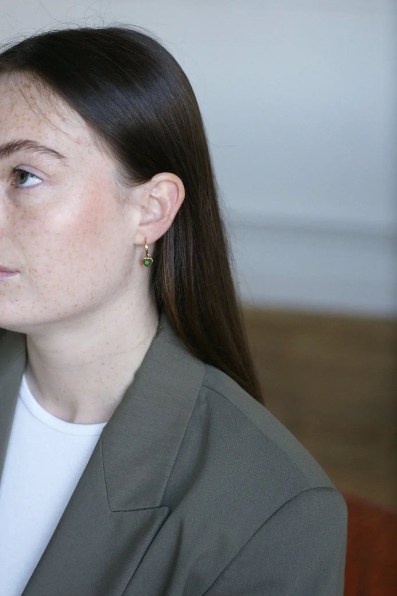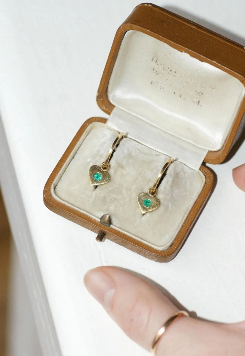 Earrings Square wire hoop earrings yellow gold 18K (hallmark: owl), set with a removable heart-shaped pendant, set with round emeralds (probable origin: Colombia) whose total weight is estimated at approx. 0.15 carat. Condition: slight micro-scratches on the gold parts, natural inclusions in the emeralds.