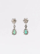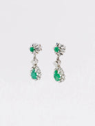 Vintage diamond emerald white gold earrings Pair of dangling earrings in 18k gold (750°/°°), diamonds and emeralds. The earrings are composed of an upper part representing a star set in its center with a round emerald weighing approximately 0.10 carat. This supports as a pendant a motif composed of a round brilliant-cut diamond weighing 0.15 carat (G VS) which surmounts a pear-cut emerald weighing approximately 0.50 carat in a surround of diamonds for approximately 0.30 carat (G VS). Vintage French work 1970/1980. Presence of the eagle's head hallmark for 18 carat gold. Height: 11 mm Gross weight: 8.13 grams (without the closure system)