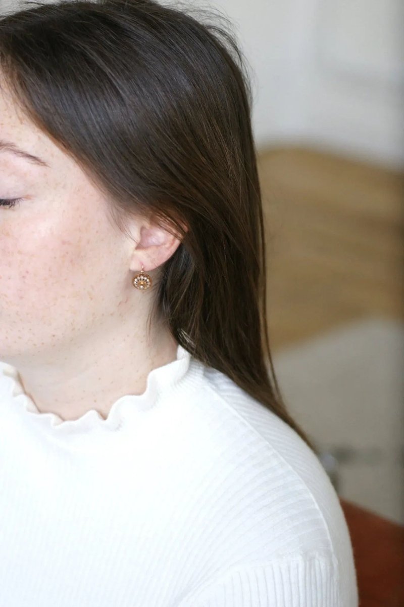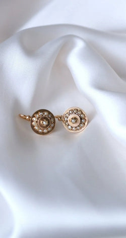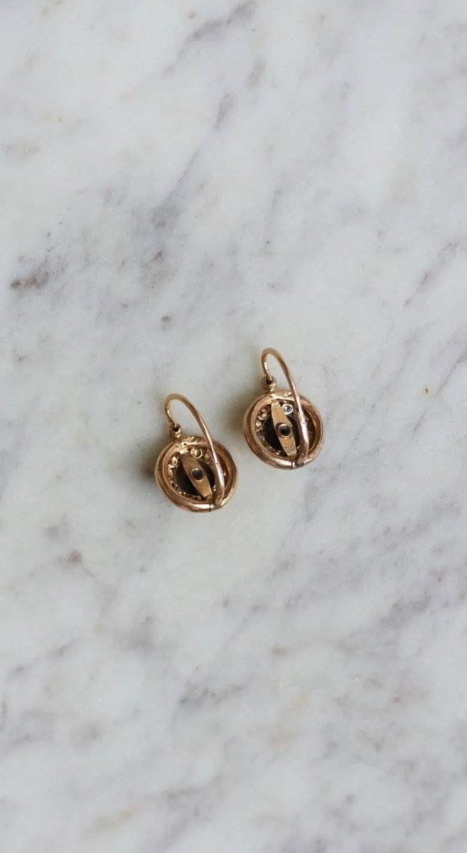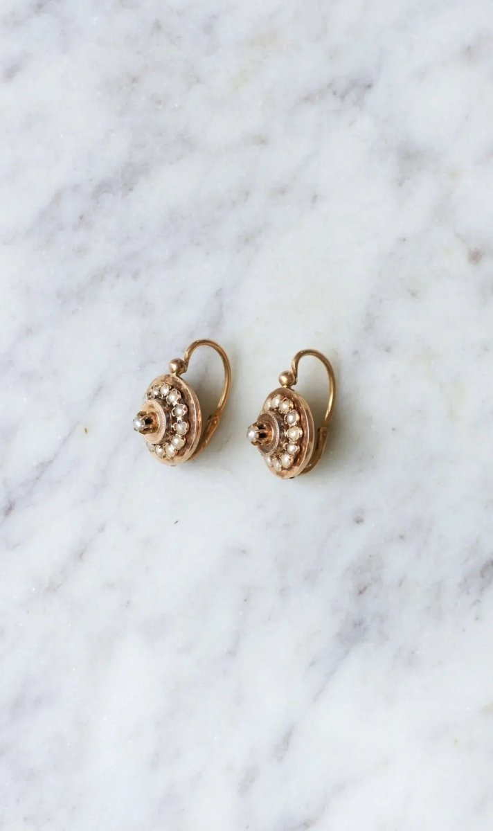 Disc sleeper earrings in 18kt rose gold (eagle's head hallmark), the center of which is decorated with a fine pearl, in a surround of fine pearls. French work from the 19th century. Gross weight: 2.42g Height: 1.80 cm Width: 1.30 cm Condition: very slight micro scratches, dents, and oxidation on the gold parts and the pearls, see photos. Did you know ? The pearl is the result of natural protection, created by the shells following an external attack: the shell of the mollusk produces a mass of calcium carbonate, also called nacre, and thus constituting the pearl. If you have not read it, we invite you to read our article on organic materials . All our antique earrings.