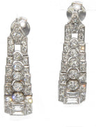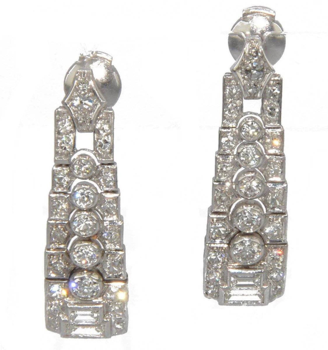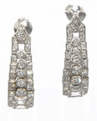 Long pair of earrings dating from the 1930s entirely paved with baguette diamonds and round diamonds. For pierced ears modifiable Material: Platinum Hallmark: Dog head Weight: 11.2 grams Length: 3.3cm Width: 1cm Number of stones:52 Total Carat: 1.80cts Period:1930