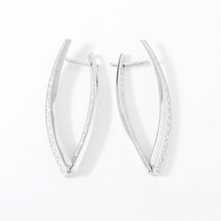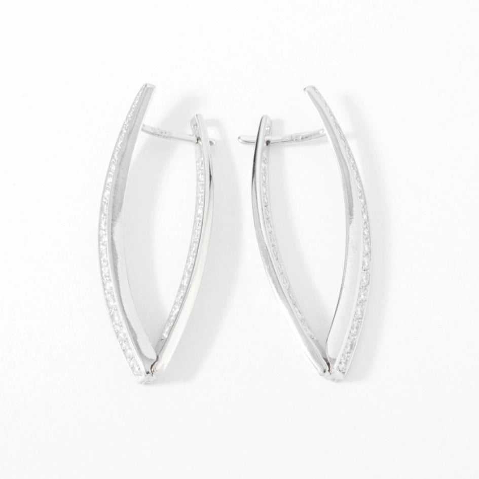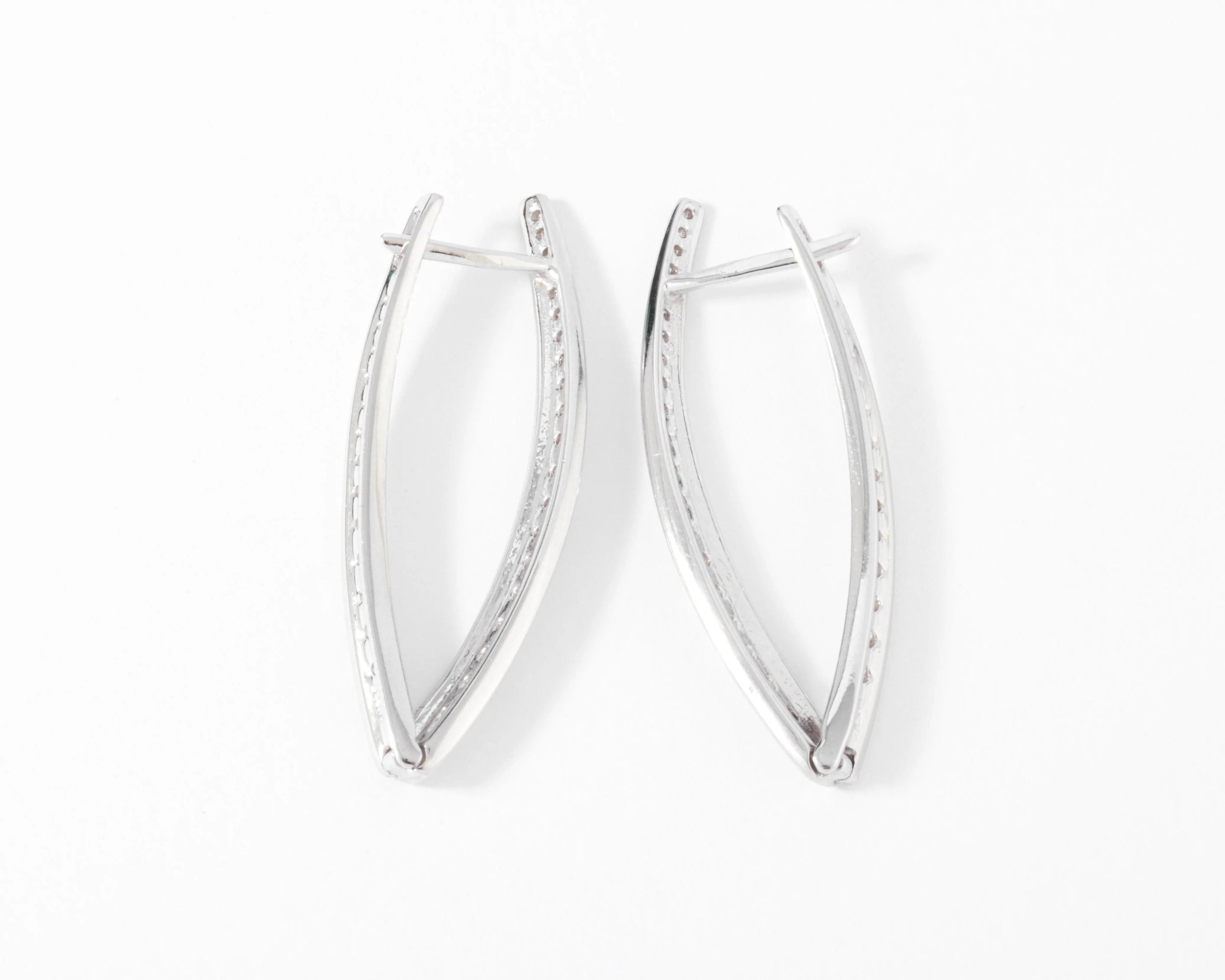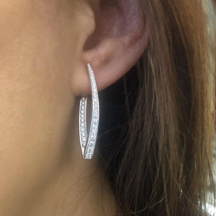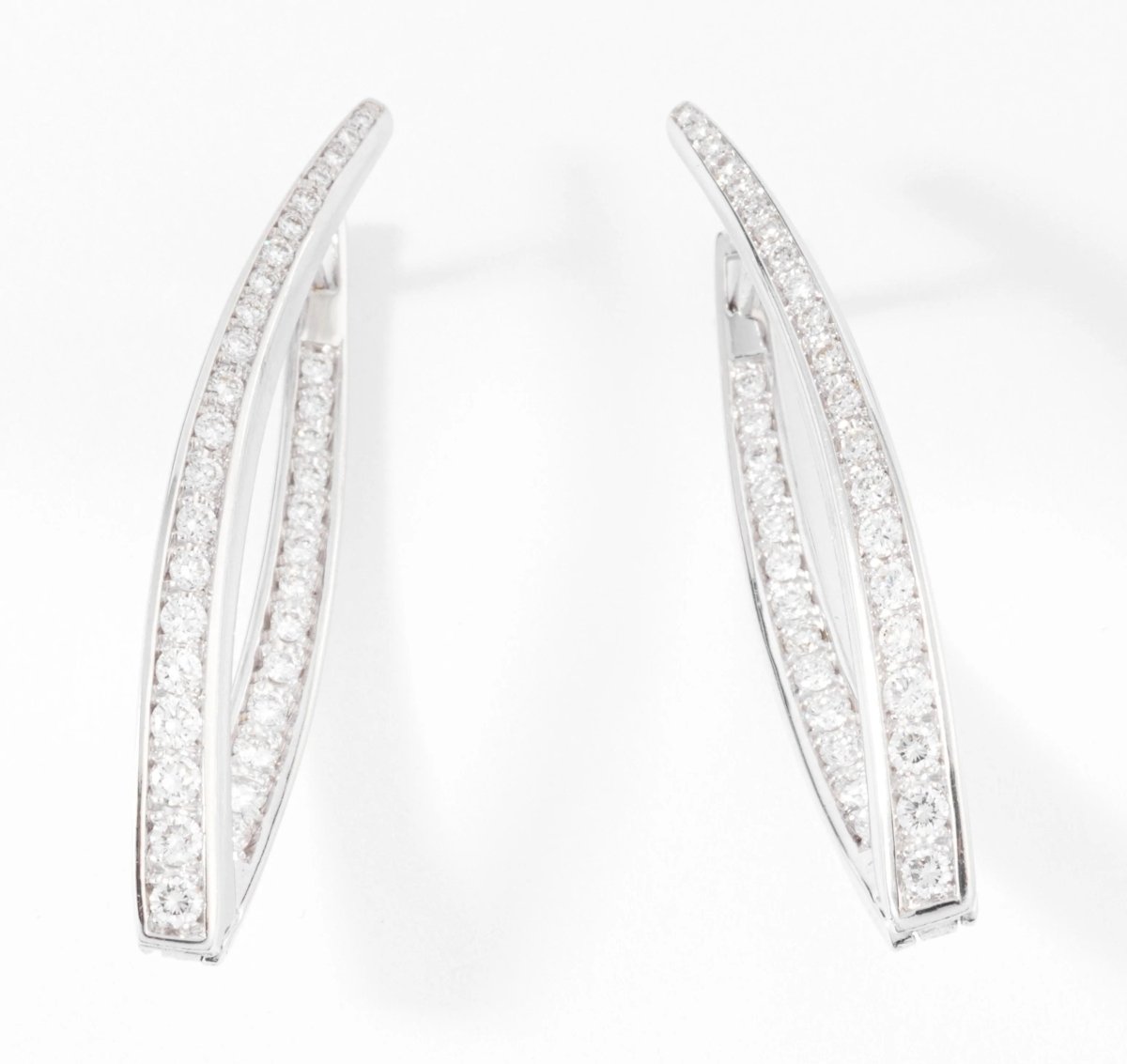 A pair of geometric earrings paved on the front and inside with brilliant-cut diamonds. For pierced ears not modifiable Material: White gold Hallmark: Eagle head Weight: 6.8 grams Length: 3.5cm Number of stones: 68 Total Carat: 1 ct Period: 2000