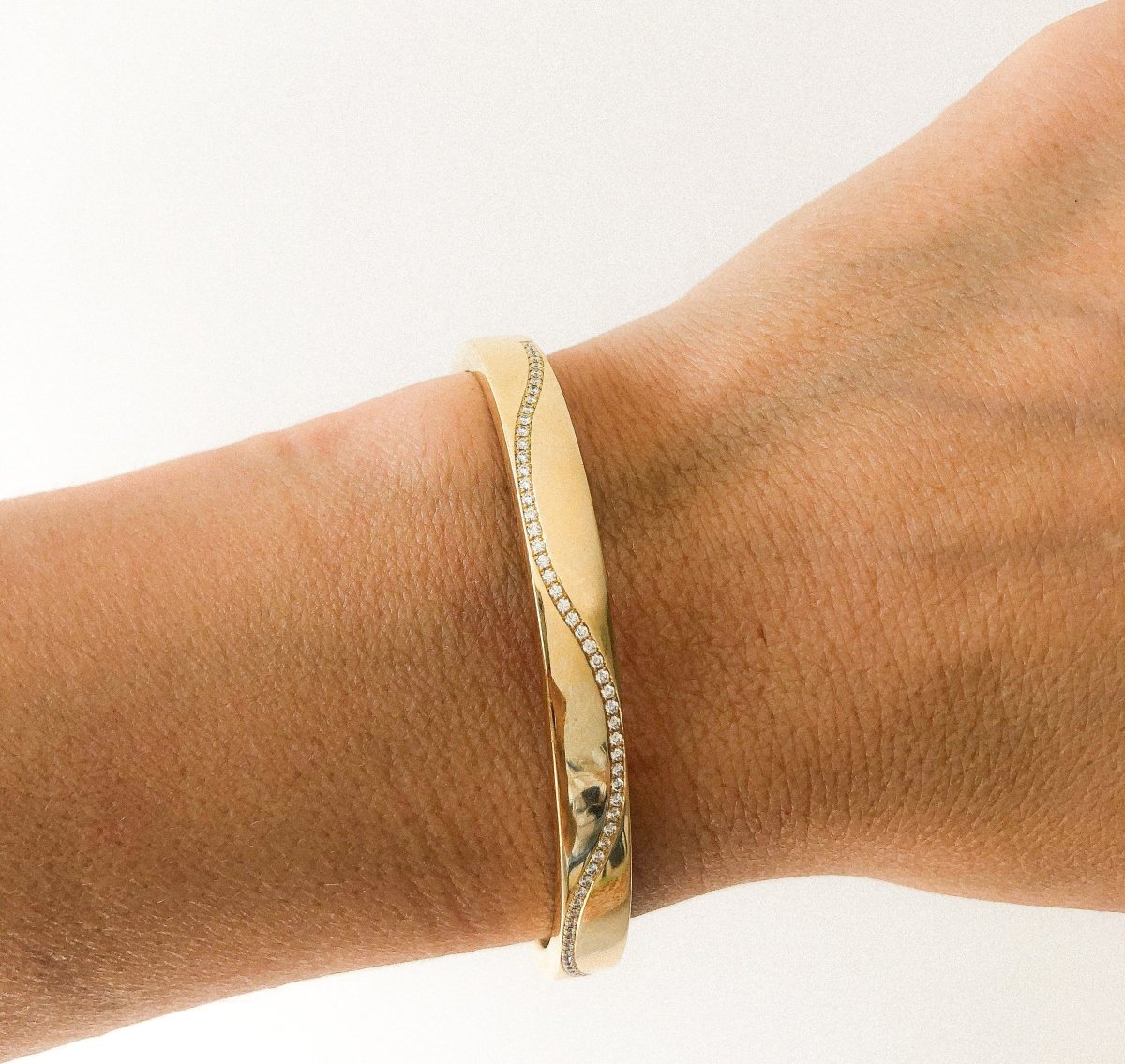 Opening yellow gold bangle bracelet decorated with a wave diamond border. Material: 18K yellow gold Hallmark: Owl Weight: 27 grams Width: 0.7 cm Diameter: 6.6 Number of stones: 71 Total Carat: 0.60 ct Period: 2010