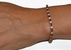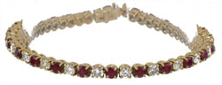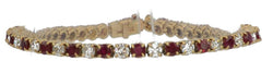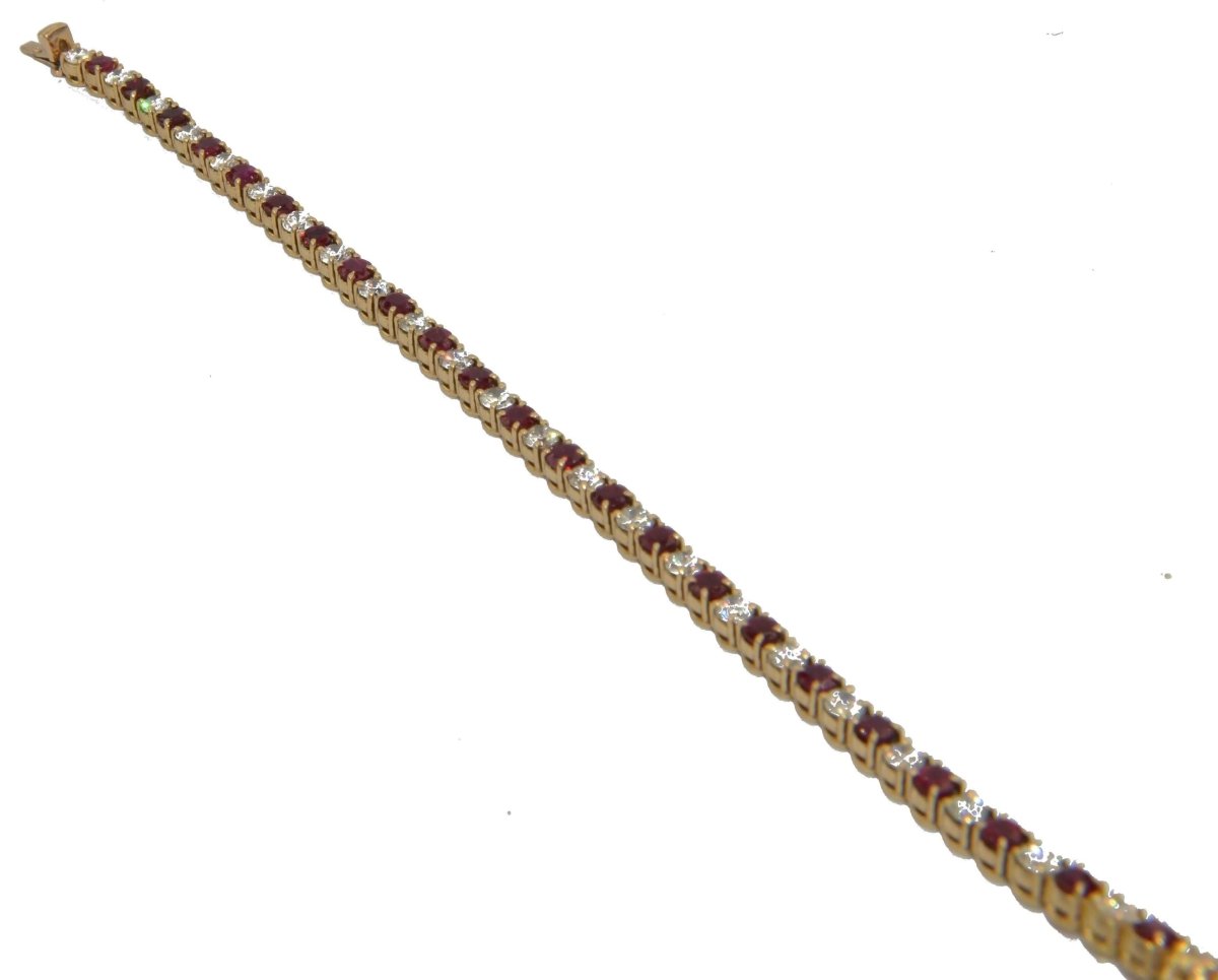 Yellow gold river bracelet adorned with brilliant-cut diamonds alternating with round rubies. Material: 18k gold Hallmark: Eagle head Weight: 14.7 grams Length: 17.5cm Width: 0.3 cm Number of stones: 24 diamonds and 24 rubies Total Carat: 4.80cts Period: 2000