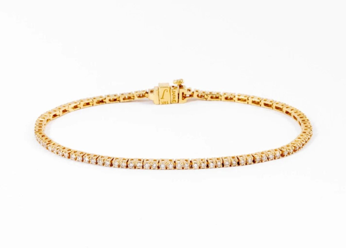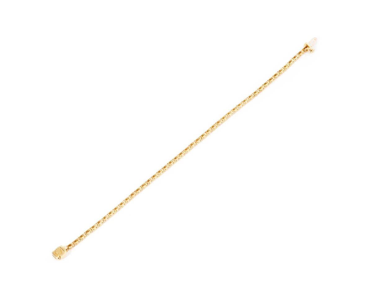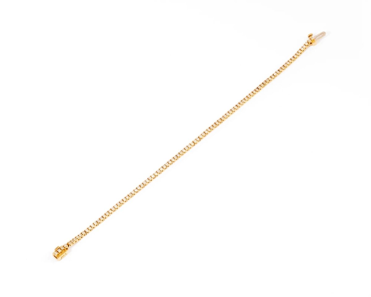 Riviere bracelet in yellow gold, adorned with 94 modern-cut diamonds in a prong setting. Material: 18k yellow gold Hallmark: Owl Weight: 7.5 grams Length: 18cm Width: 0.4cm Carat number: 1.90cts Number of stones: 94 stones Period: 2000