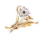 A brooch in 585/000 yellow and white gold depicting a bouquet of flowers and foliage held by a ribbon, punctuated with pink sapphires and brilliant-cut diamonds.
