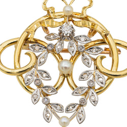 Art Nouveau brooch in yellow gold. white gold and 750 thousandths (18 carat) pink gold. set with 4 cultured pearls. 1 old cut diamond. with a weight of approximately 0.03 ct. and 26 rose-cut diamonds. each weighing approximately 0.01 ct. total weight of diamonds: approximately 0.29 ct. dimensions: 4.32 cm x 3.42 cm. total weight: 6.4 g. eagle head hallmark. excellent condition