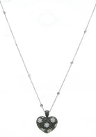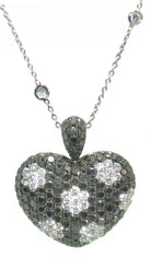 Beautiful heart pendant entirely paved with black and white diamonds, held by a round força white gold chain alternating with white diamonds in a bezel setting. Material: 18k white gold Hallmark: Eagle head Weight: 7.6 grams Length: 43cm Width: 25 cm Total Carat: 3cts Period: 2000