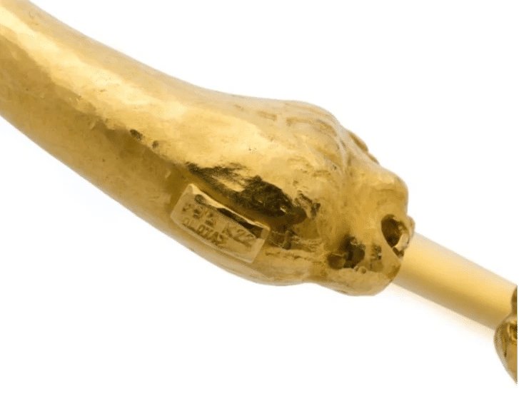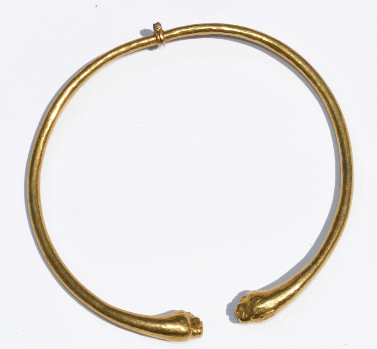 Zolotas necklace in 22k hammered yellow gold opening ending with two lions' heads. Material: 22k yellow gold Hallmark: Signature Weight: 69.5 grams Diameter: 14 cm Period: 1970