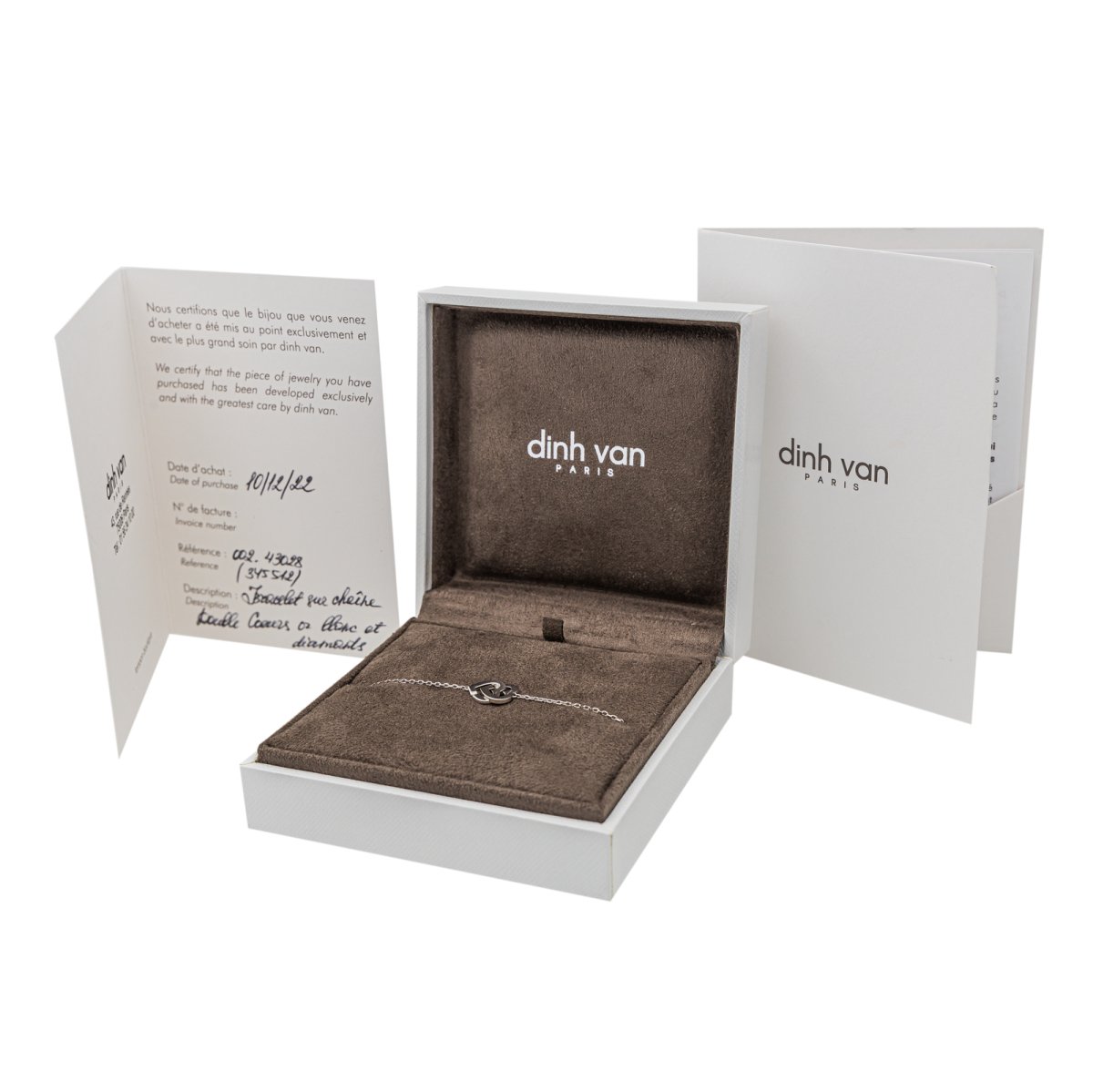 Bracelet signed by Maison Dinh Van in 18 carat white gold, Double Coeur R10 model, set with 18 brilliant-cut diamonds, each of approximately 0.005 carat. Estimated total weight of diamonds: 0.09 carat. Length: 17 cm. Adjustable to 16 cm and 15 cm. Width: 1.00 cm. Total weight: 1.91 g. Sold with original box and certificate. Excellent condition