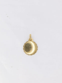 Love medal in 18k (750°/°°) yellow gold set with two synthetic rubies. The medal is surrounded by an oval motif characteristic of the Maison AUGIS productions in 1970. This model is no longer available for sale today. The famous words Plus qu'hier Moins que demain, inspired by the verses of Rosemonde Gérard Rostand, are inscribed on the medal. French work from the 1970s, signed A.Augis. Presence of the eagle's head hallmark and the manufacturer's hallmark on the bail. Height including bail: 2.5 cm Diameter: 1.7 cm Weight: 2.15 grams