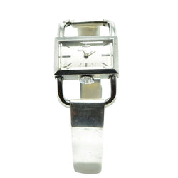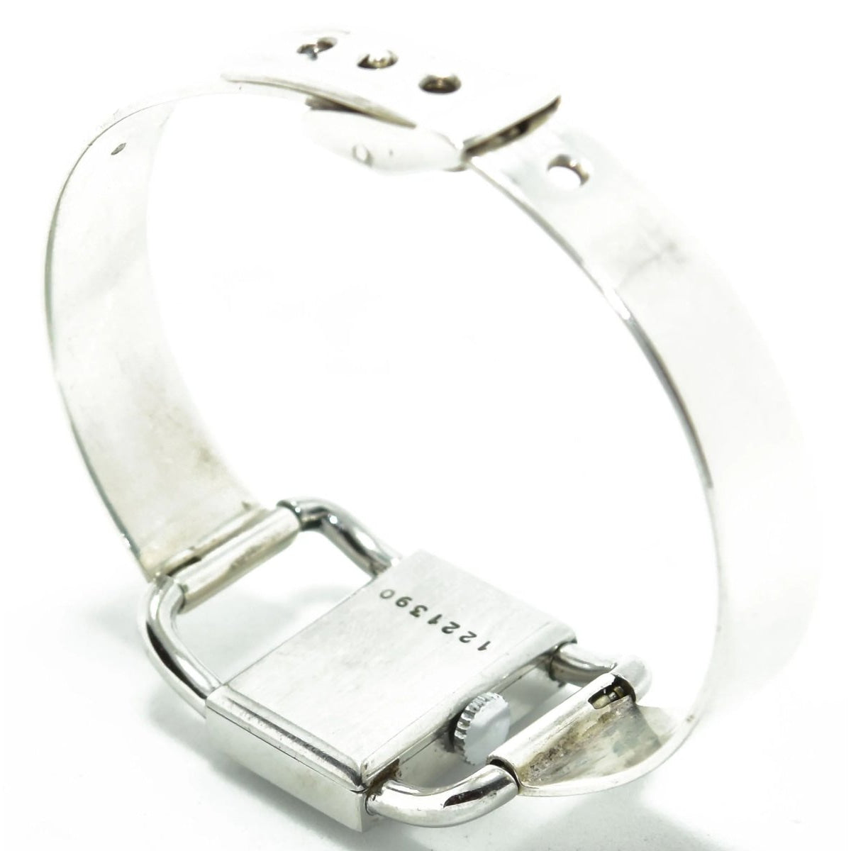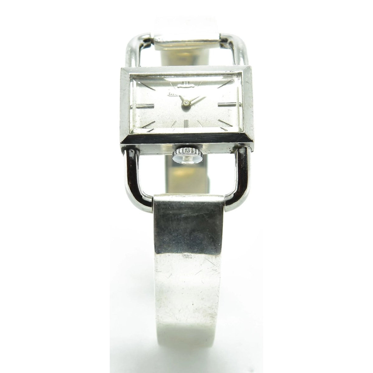Jaeger Lecoultre bracelet watch Etrier model in steel made for the house of Hermès Rectangular steel case with stirrup handles, on rigid steel bracelet, possibility of replacing with a leather strap. The movement has been revised Mechanism: Mechanical Material: Steel Hallmark: Hermès Jaeger Lecoultre signature, numbers Weight: 30.4 grams Length: 2.3cm Width: 1.5cm Period: 1960-1970