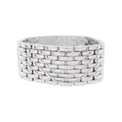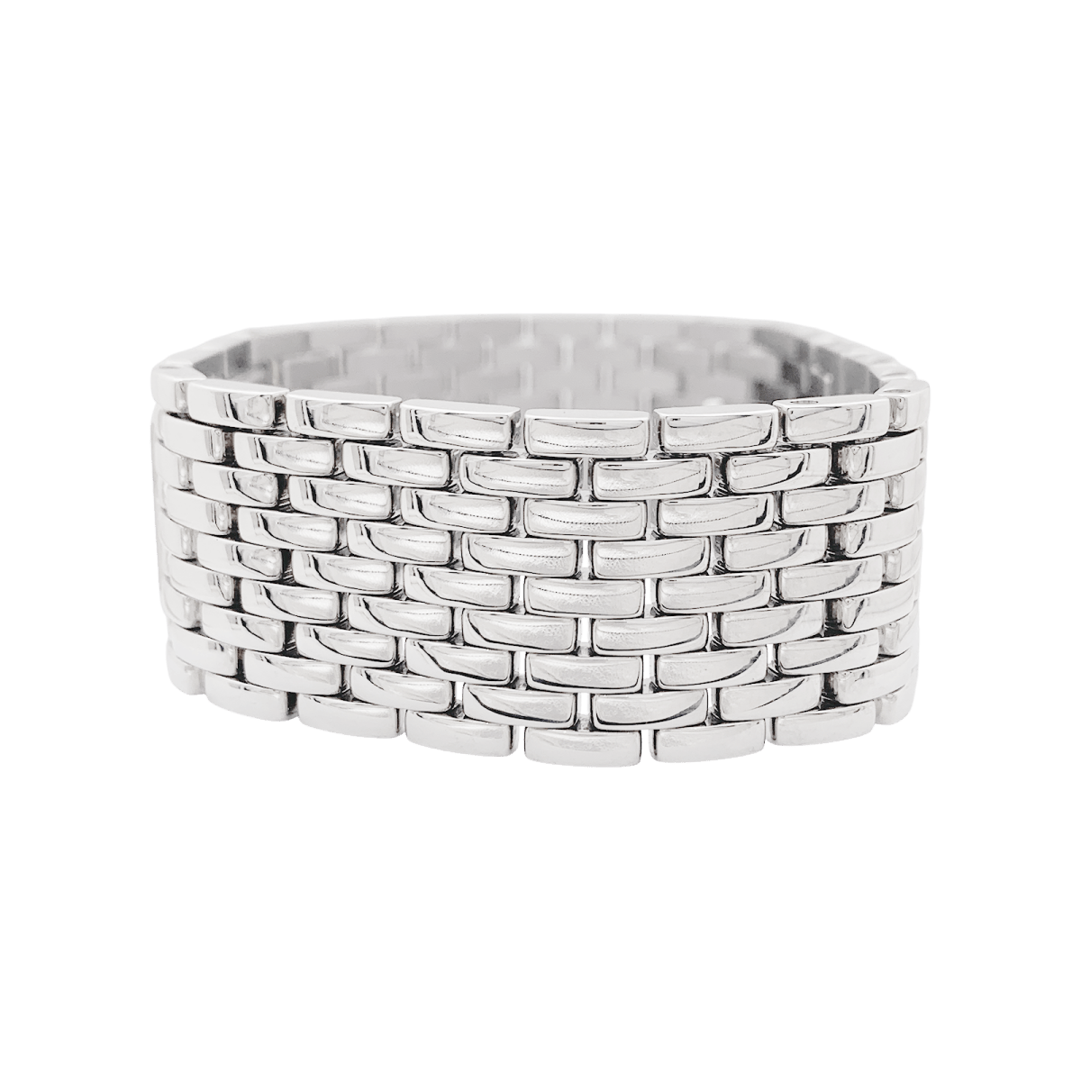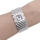 Watch CARTIER "Panthère Ruban" cuff in mother-of-pearl steel on a 9-row panther mesh bracelet with double folding clasp. White mother-of-pearl dial, Roman numerals.