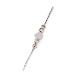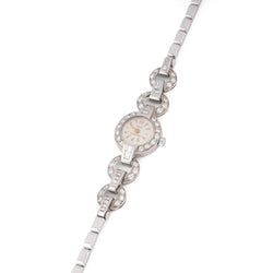 Beautiful art deco watch in Platinum, gold and Diamonds enriched with round links embellished with baguette diamonds and brilliant-cut diamonds. The movement is quartz. Material: Platinum and white gold Hallmark: Dog head Weight: 24 grams Length: 17.5cm Width: 1cm Total diamond: 0.80 ct Period: Art Deco