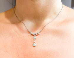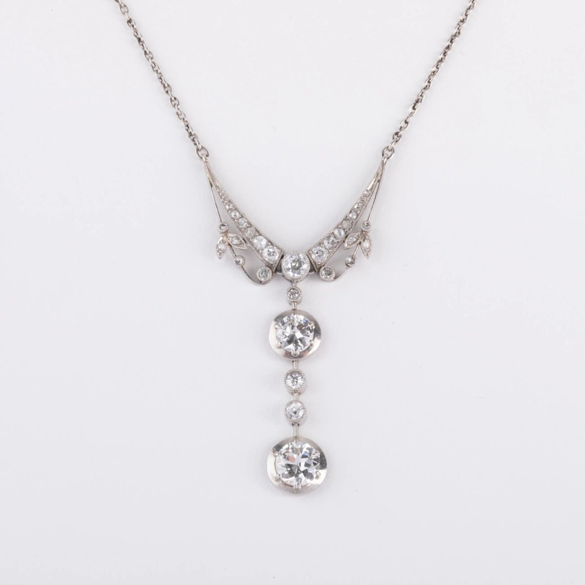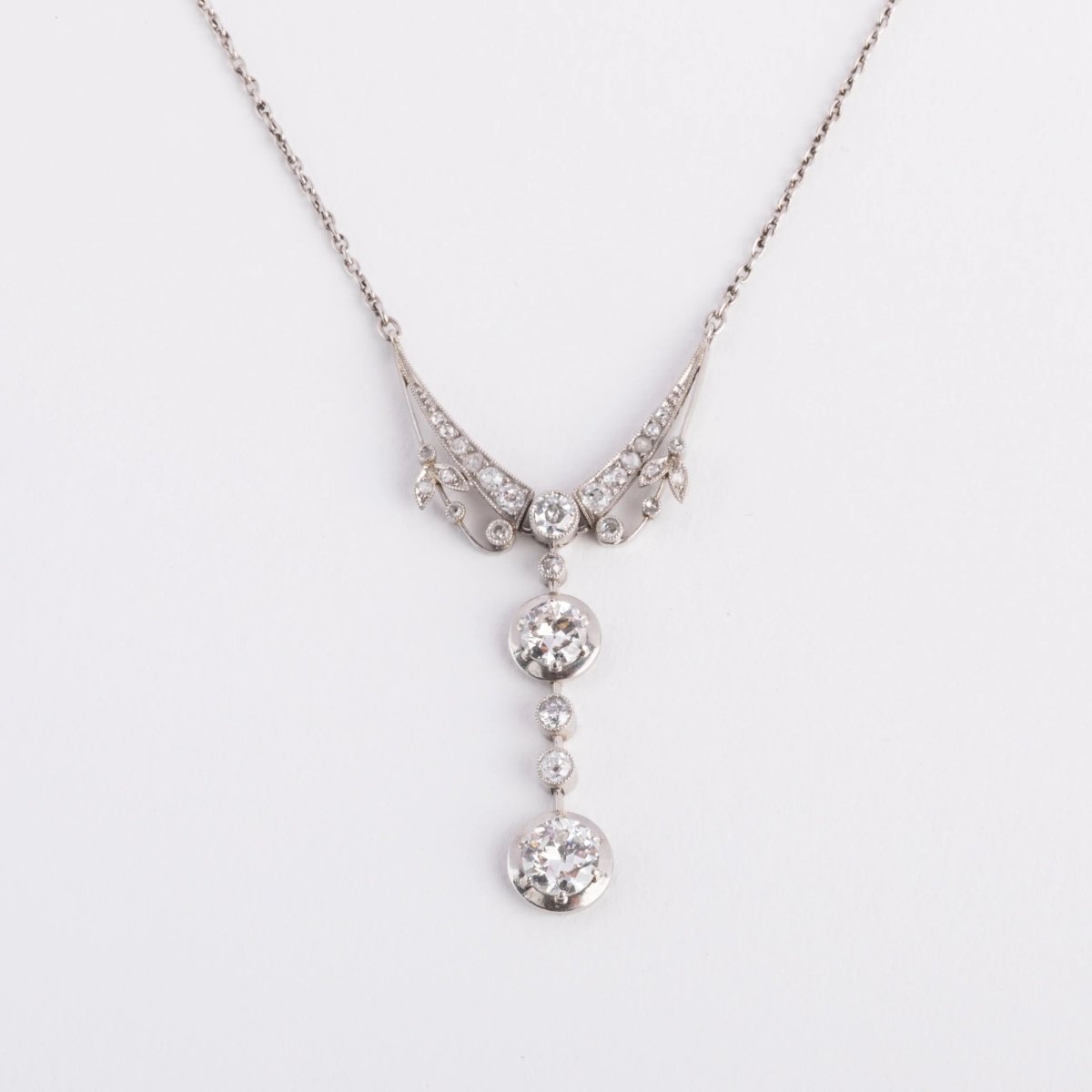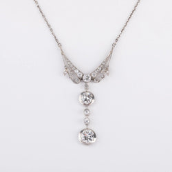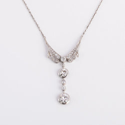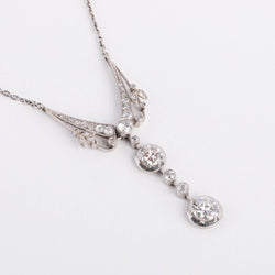 Platinum and diamond pendant from the 1930s floral pattern adorned with old cut diamond and rose including 2 larger diamonds. Material: Platinum Weight: 6.1 grams Length: 22.3 cm Number of stones: Total Carat: 0.30 and 0.50 ct Period: 1930