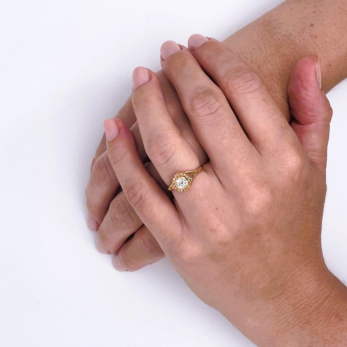 Bague de fiançailles ancienne, ornée d'un diamant en solitaire sur un jonc en or rose 750/1000 (18K), le panier est surélevé et joliment ajouré en volutes. Le diamant, de forme coussin, taillé à l'ancienne, est en serti clos. Poids estimé du diamant : 0,50 ct environ. Tour de doigt : 52 (modifiable). Poids brut : 3,26 g Poinçon Tête d'Aigle, travail français. Epoque : années 1900-1920 (Art Nouveau)