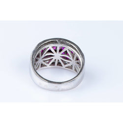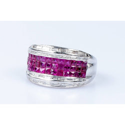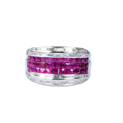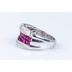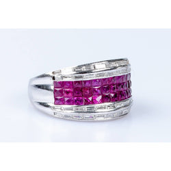 Bague en or blanc 18 carats ornée 43 diamants taille baguette de 0.03 carats chacun; soit 1.29 carats au total et de 36 rubis carrés de 0.05 carats chacun, soit 1.90 carats au total. Qualité du diamant Couleur : F - H Clarté : VS - SI Poids : 9.88 gr. Taille : EU : 55 - IT/ES : 15 - US: 7.5 Dimensions : 1.30 x 1.90 cm Largeur de l'anneau : 0.40 cm Poinçon d'or 18 carats tête d'aigle marqué sur le bijou. Etat : neufBijou livré avec son certificat international AIG dans un coffret luxueux.