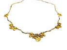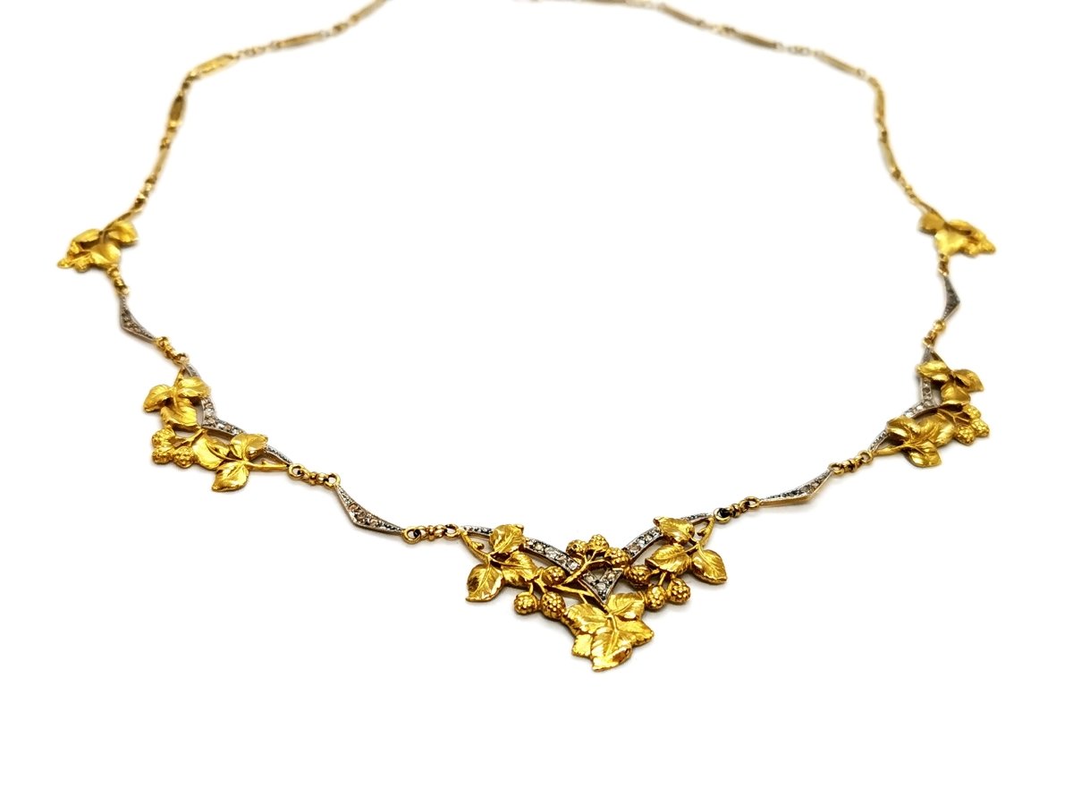 Collier art déco. bicolore. en or jaune 750 millièmes (18 carats). serti sur platine. de 29 diamants (taille rose). pour environ 0.15 ct au total. motifs feuilles. jolie travail des années 30. longueur: 45 cm. largeur chaîne: 0.27 cm. dimensions motif central: 3.6 cm x 1.8 cm. poids total: 13.62 g. poinconné tête d'aigle. excellent état