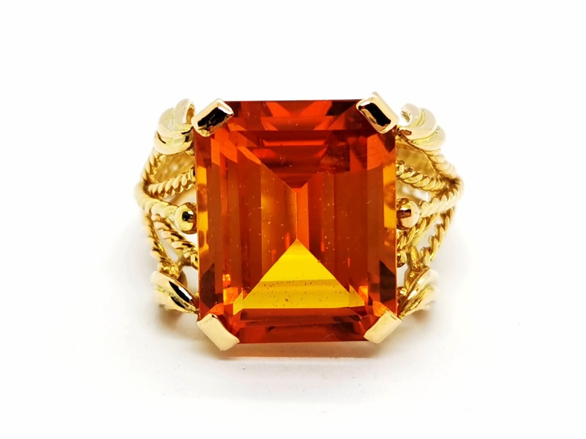 Bague cocktail. en or jaune 750 millièmes (18 carats). corps de bague ajouré et torsadé. sertie d'une citrine taille rectangulaire d'environ 11.12 carats (dimensions 16.3 mm x 13.2 mm). largeur sur le dessus: 1.63 cm. tour de doigt: 59. poids total: 10.78 g. poinçonné Hibou. excellent état.