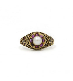 Bague Art-Nouveau en or jaune 750. sertie d'une perle accompagnée de rubis et de rose cut.Tour de doigt : 54Mise à taille possible.