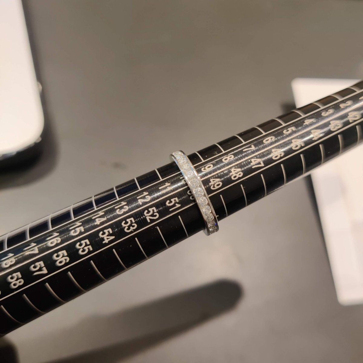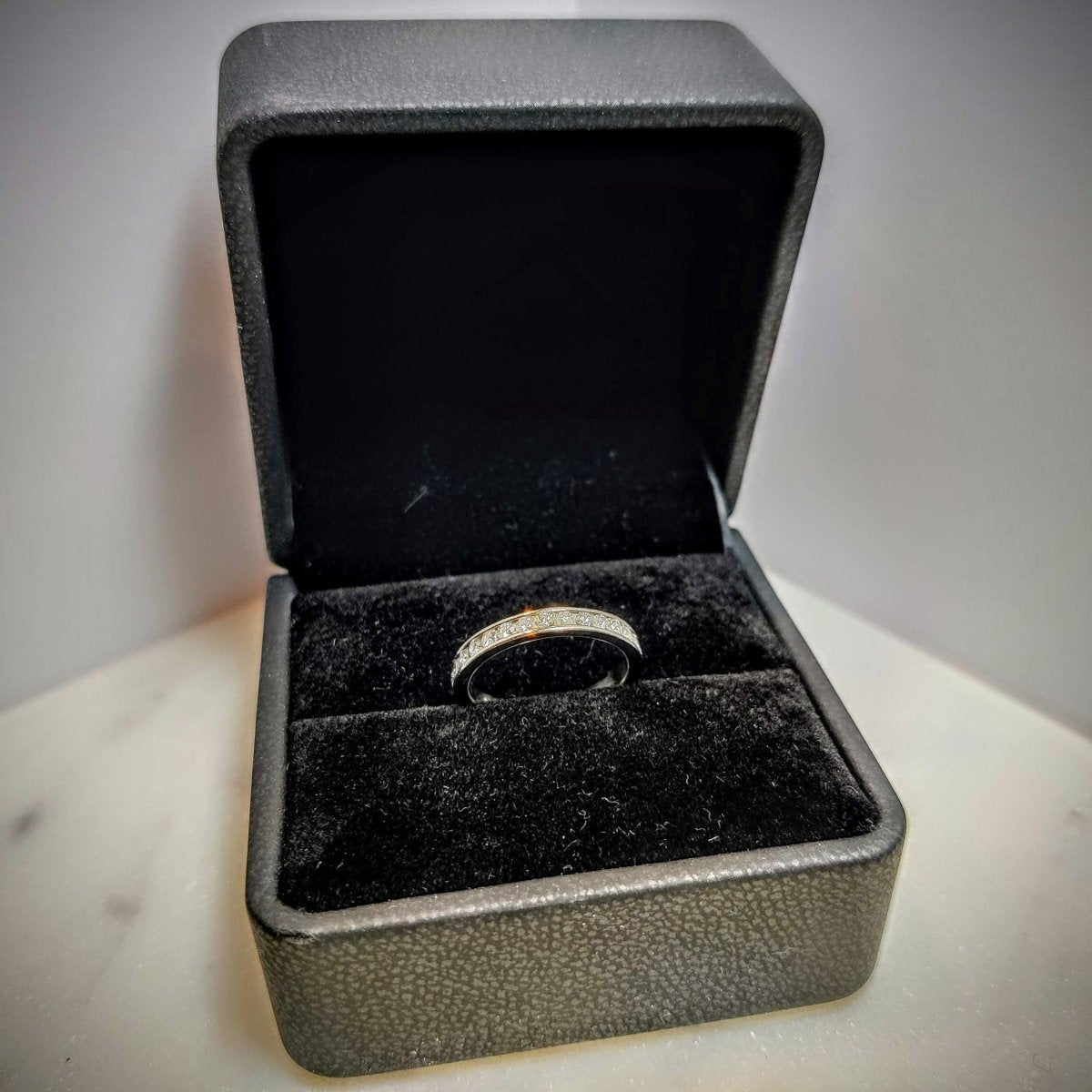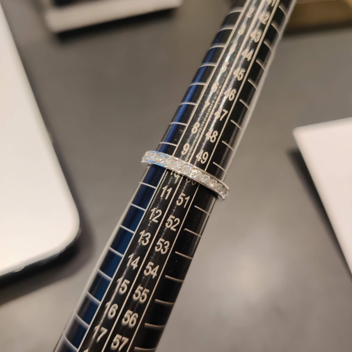 Alliance en platine et diamants Tour complet Poinçonnée 30 diamants taille brillant serti rail Poids total des diamants : 0,75 carat Taille de doigt 50 largeur de bague : 2,6 mm Poids brut : 3,4 gr Poli(e), Authenticité et qualité contrôlée, Remis(e) à neuf