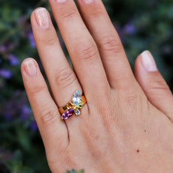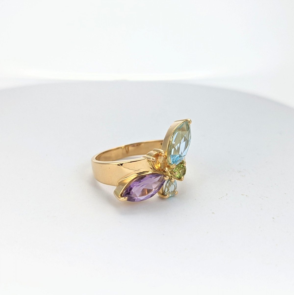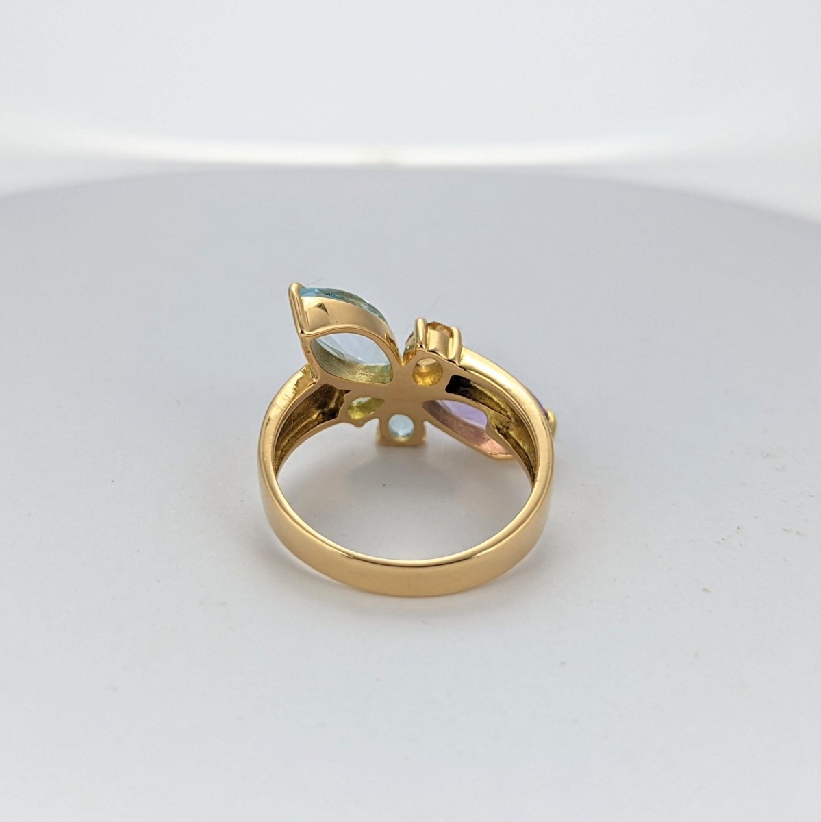 Bague en or jaune 18 carats - 750 millièmes Poids brut 5,66 gr Tour de doigt 54 mm Longueur du haut de bague 19,3 mm Largeur du haut de bague 14,4 mm Hauteur du haut de bague 4,3 mm Citrine, aigue-marine, améthyste, tourmaline