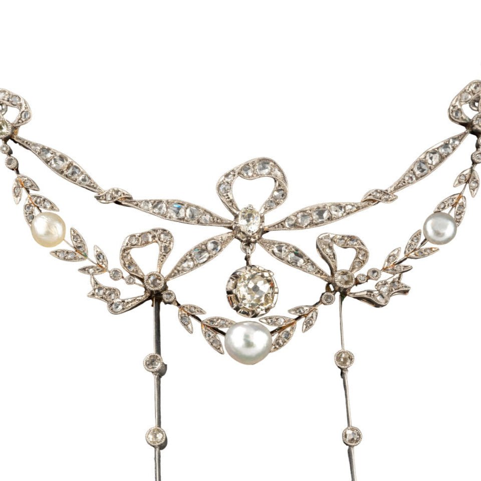 Collier en or blanc 18 carats et platine, orné au centre d'un motif draperie à décor de noeuds de ruban, serti de diamants de taille ancienne et taillés en rose, retenant deux pampilles de forme ronde ornées de diamants de taille ancienne dans un entourage de petites perles.