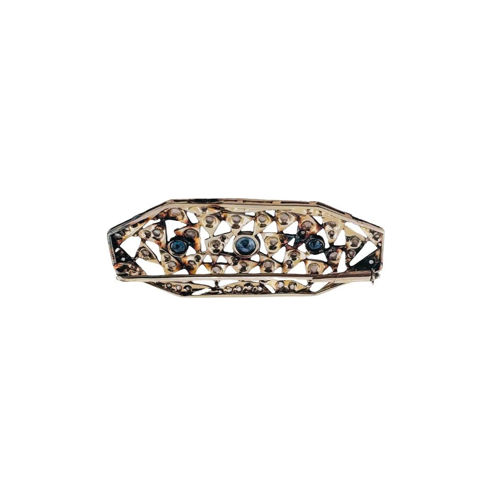 Broche Art Déco aux motifs géométriques (années 1920-1930) en Or blanc 14 carats et Platine, ornée de diamants taillés en rose et serti clos de trois saphirs. La broche est en platine, l'épingle de fixation est en or blanc. Fermeture par système à pompe.