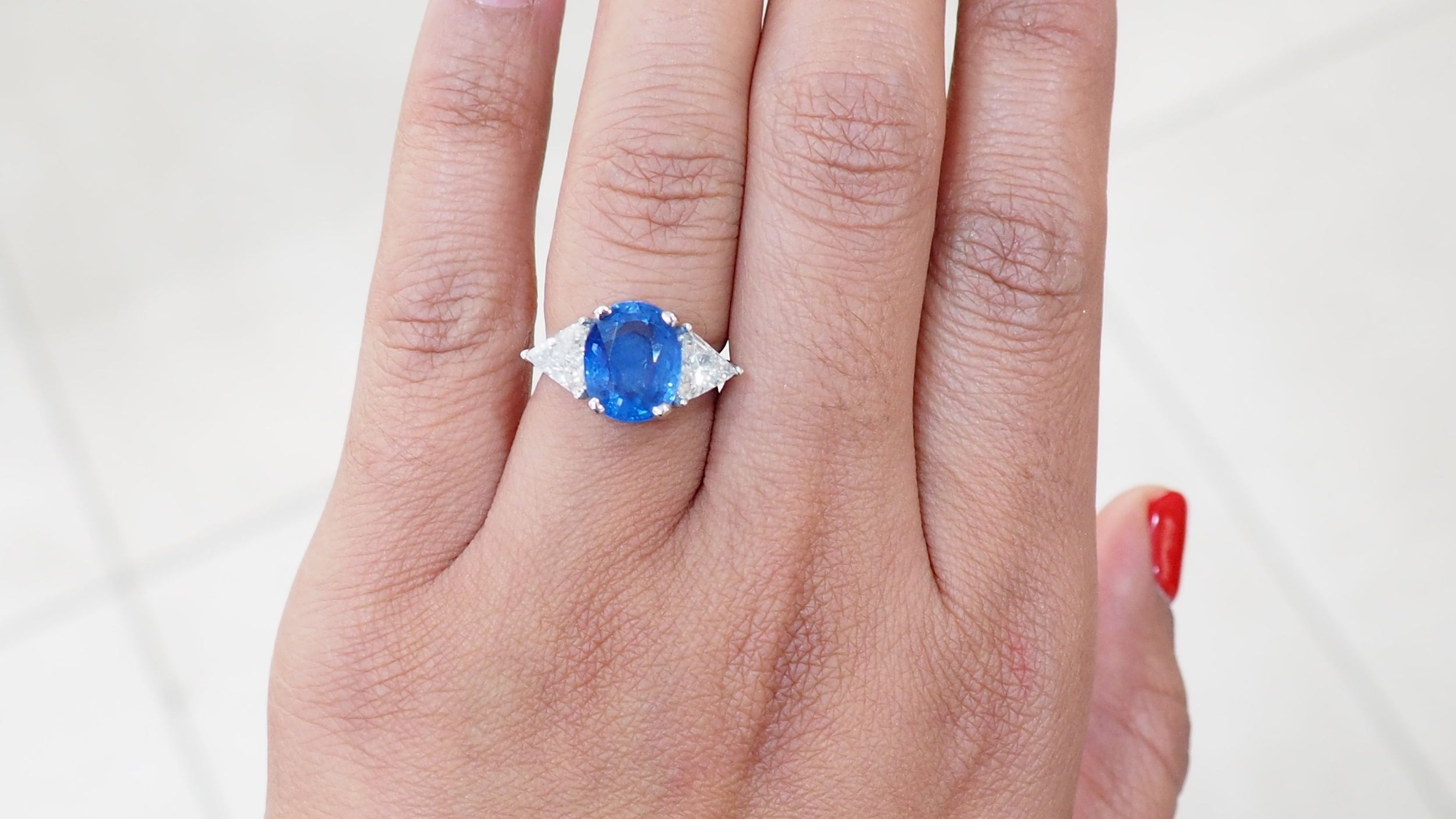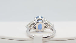 Bague en or blanc 18 kt / 750 millièmes ; 5,30 g ; Sertie d'un saphir bleu naturel de Ceylan 6,5cts; Epaulé de 2 diamants triangles 1ct chacun ; Tour de doigt : 52 ;